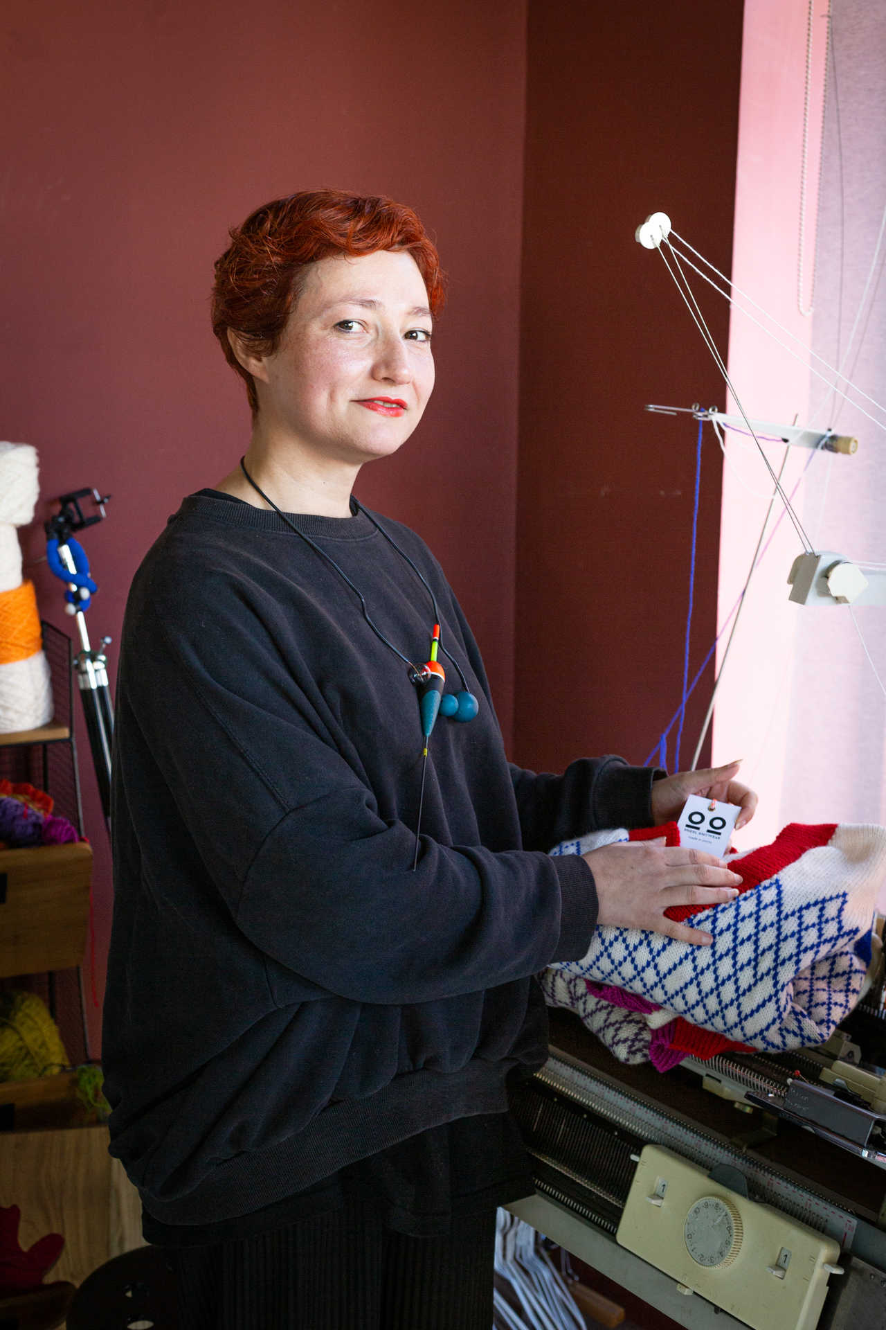 Aquele equipamento auxiliar vintage dispensa o uso de energia elétrica e tem algumas limitações que Maria João entende como um estímulo à criatividade. Brincando com cores e padrões, e optando por lã portuguesa, vai fazendo cada vez mais peças únicas, camisolas e acessórios como gorros e cachecóis – algo muito valorizado pelos clientes, que exibem, assim, algo que mais ninguém tem no guarda-roupa. E até podem ver como tudo se processa. “Trabalho aqui ao vivo, é uma barulheira. Páro quando as pessoas entram e quando o Pedro está em reunião”, comenta, aludindo a Pedro Maçana, com quem partilha aquele espaço de trabalho aberto a quem passa.