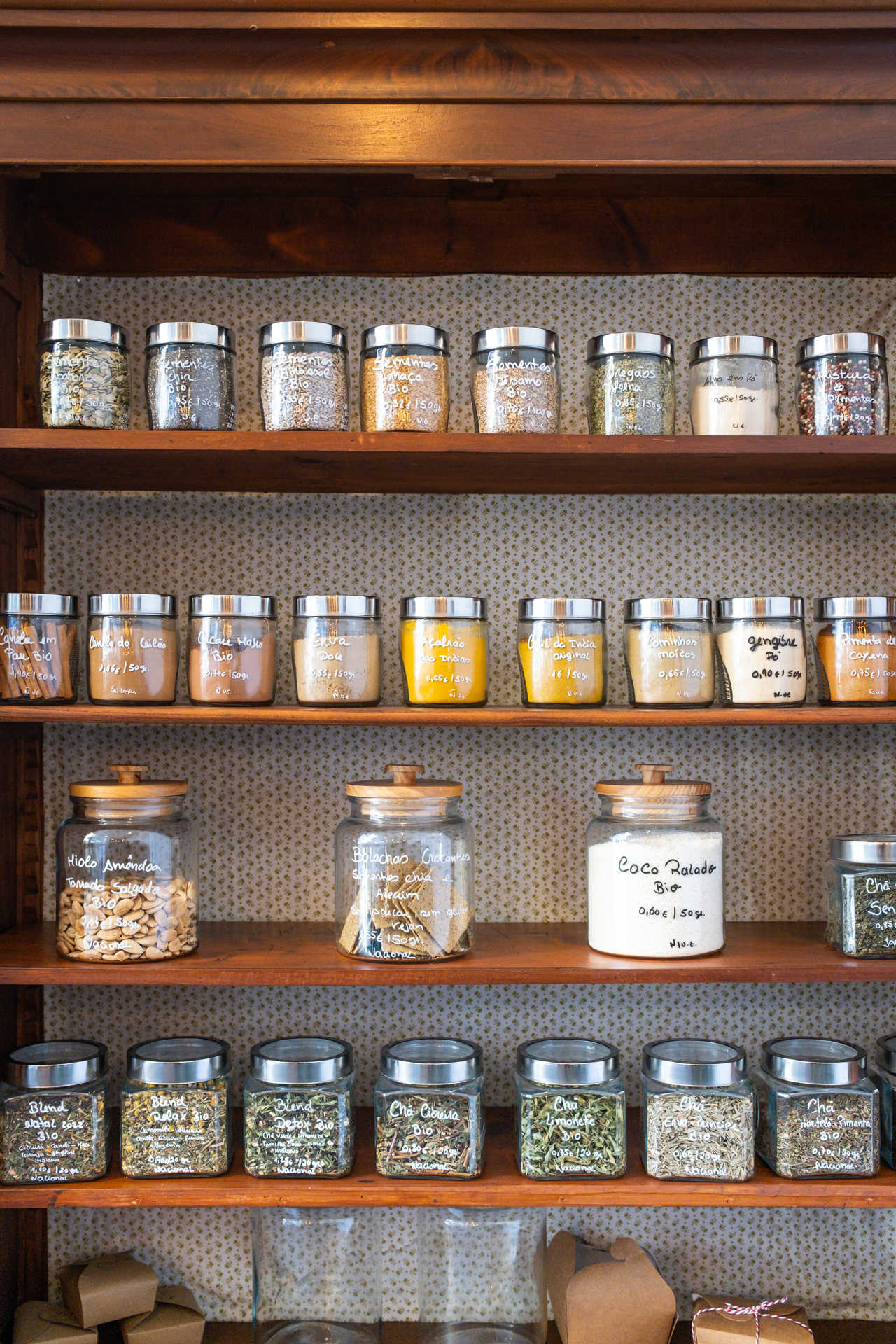 Bastou reorganizar o espaço para criar aquela área com uma seleção de produtos secos, maioritariamente biológicos, alguns deles veganos e sem glúten, muitos com mão portuguesa. A oferta – acomodada em frascos adquiridos em segunda mão – inclui desde frutos desidratados, farinhas, sementes, especiarias e chá até bombons, chocolates, gomas, bolachas e biscoitos tradicionais.