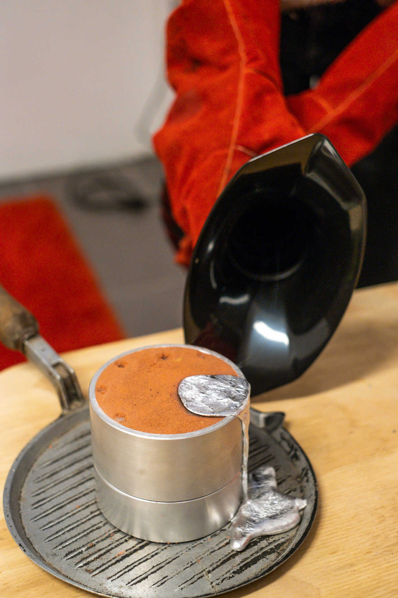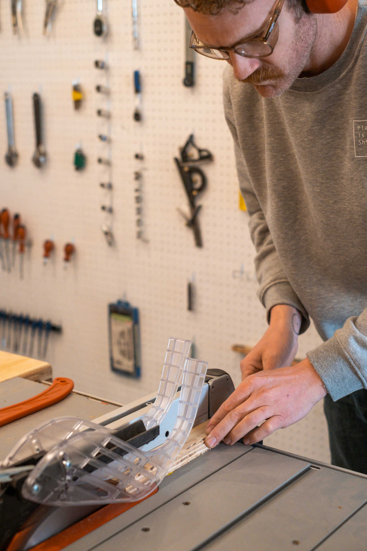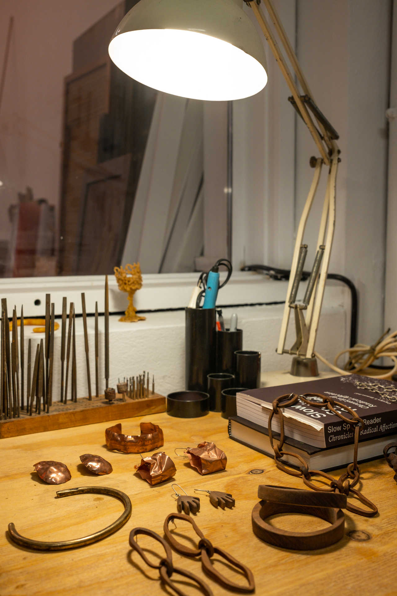Consciencializar para a importância de adotar práticas mais sustentáveis do ponto de vista ambiental é outro dos objetivos, frisa Lu, enquanto cria uma peça com alumínio cortado da própria porta, alvo de uma ligeira intervenção. Em joalharia, já usou plástico, latão e até osso, mas agora escolhe o alumínio, que considera versátil, leve e bonito, além de “infinitamente reciclável”. Garante Mike que ambos se esforçam por minimizar quaisquer danos resultantes da produção, por exemplo, combatendo o desperdício e usando sistemas de filtragem que capturem fumos e poeiras. Para saber mais, nada como ir ao estúdio, onde ferramentas adquiridas na feira da Vandoma convivem com madeiras resgatadas do lixo. Entre elas, uma cabeceira de cama que tem a palhinha danificada – por enquanto.