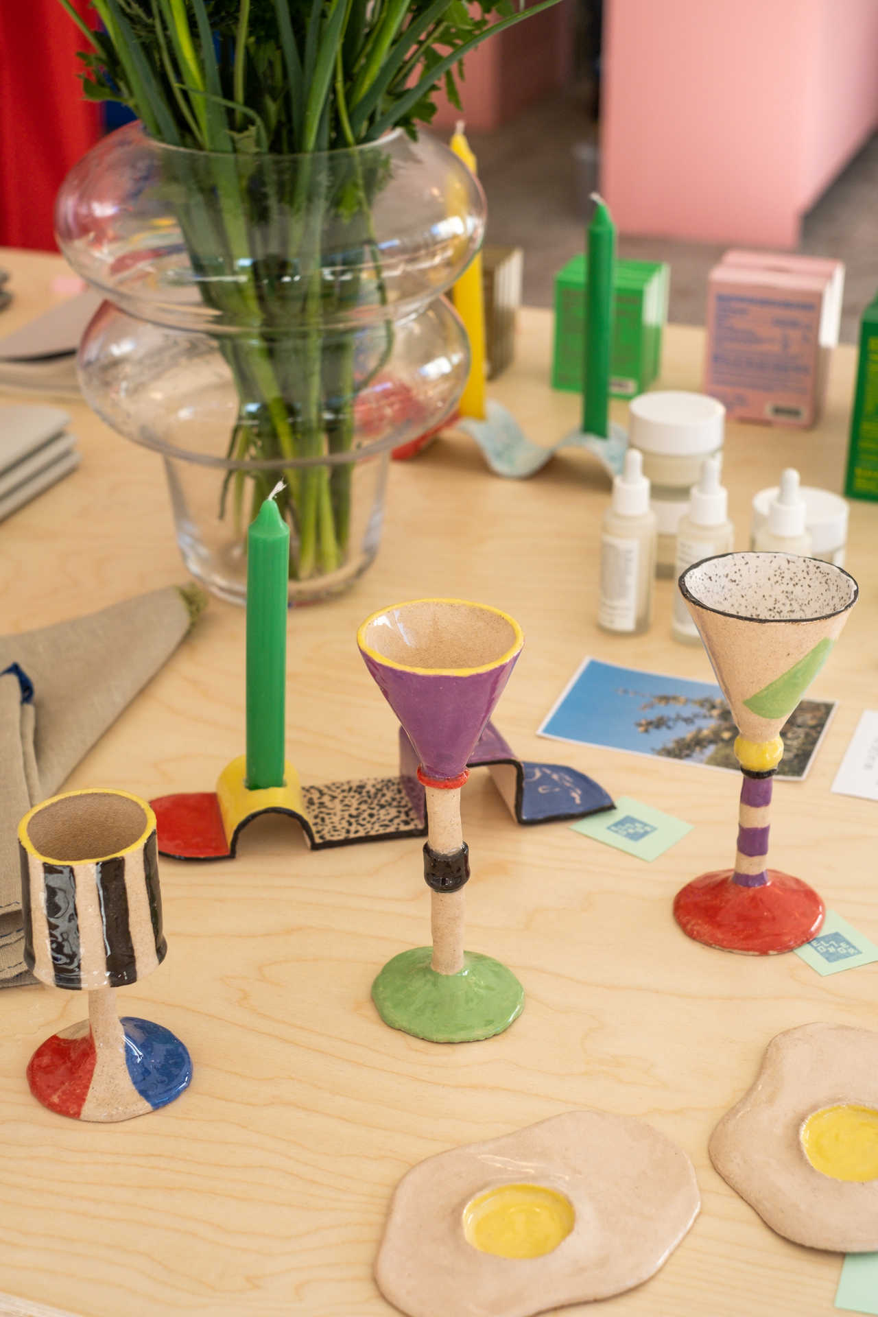 Pedro conduz os destinos da marca Wayz a par com Daniel Gonçalves. Os dois cruzaram-se numa escola de design de calçado e decidiram apostar na criação de sapatilhas fabricadas em Portugal, com materiais reciclados. “Queríamos um design intemporal, versátil, sem sazonalidade e unissexo”, recorda, diante de uma variedade de modelos de diferentes cores. À venda naquele espaço estão ainda alguns acessórios em cerâmica assinados por Maria João e peças de outros autores, que utilizam materiais como cimento, madeira e azulejo, sem esquecer a ilustração.
