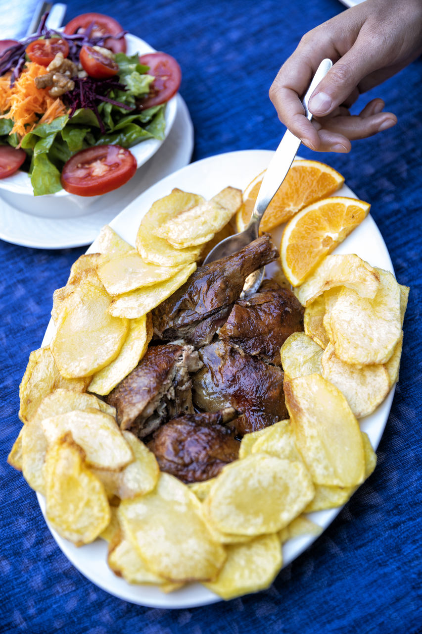 - O pato assado em forno a lenha pode ser saboreado no pátio. (Fotografia: Maria João Gala/GI)