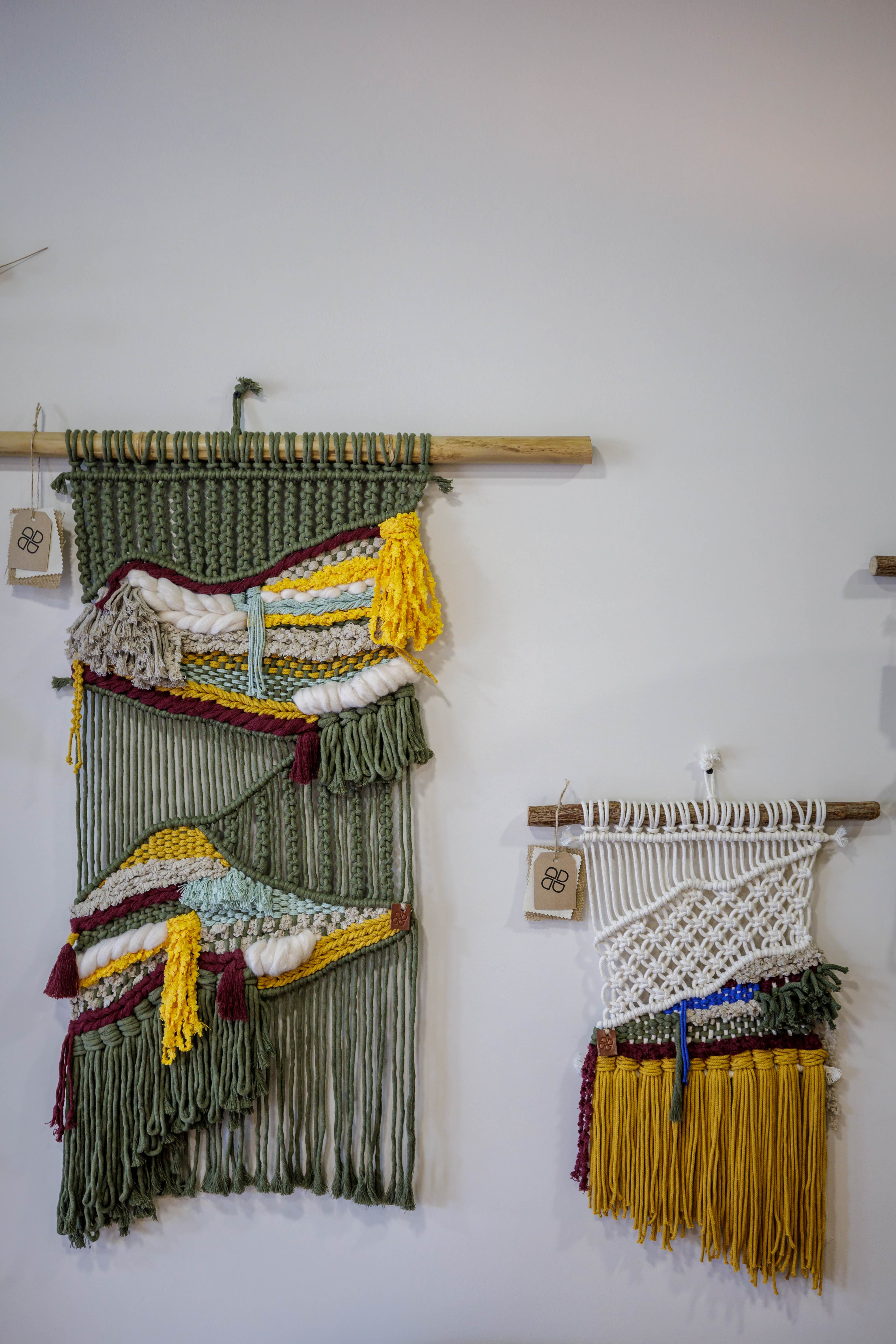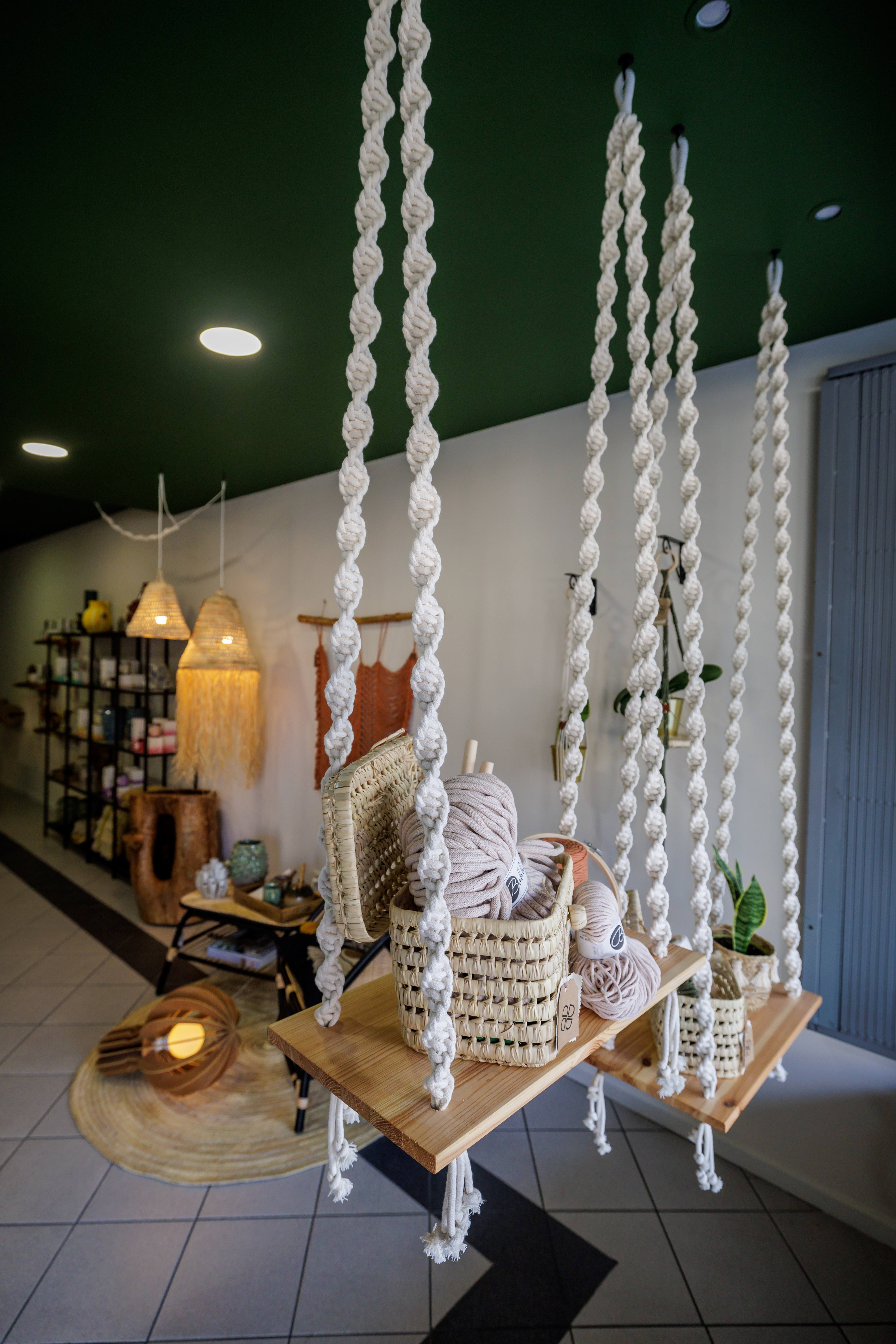 A sustentabilidade é um dos pilares do projeto e para isso Daniela Carvalho conta com a parceria da Bobbiny, uma marca polaca que produz as cordas a partir de fio de algodão reciclado e sem a utilização de corantes. Os cordões também estão à venda na loja, onde a artesã organiza oficinas e aulas individuais para quem quiser aprender a arte ancestral do macramé. Na iniciação, Daniela ensina aqueles que considera serem os cinco nós principais do macramé, e os participantes saem da aula com uma peça feita por eles. Depois há oficinas de nível intermédio e avançado, e também adaptadas a crianças. Está para breve a abertura de uma loja online.