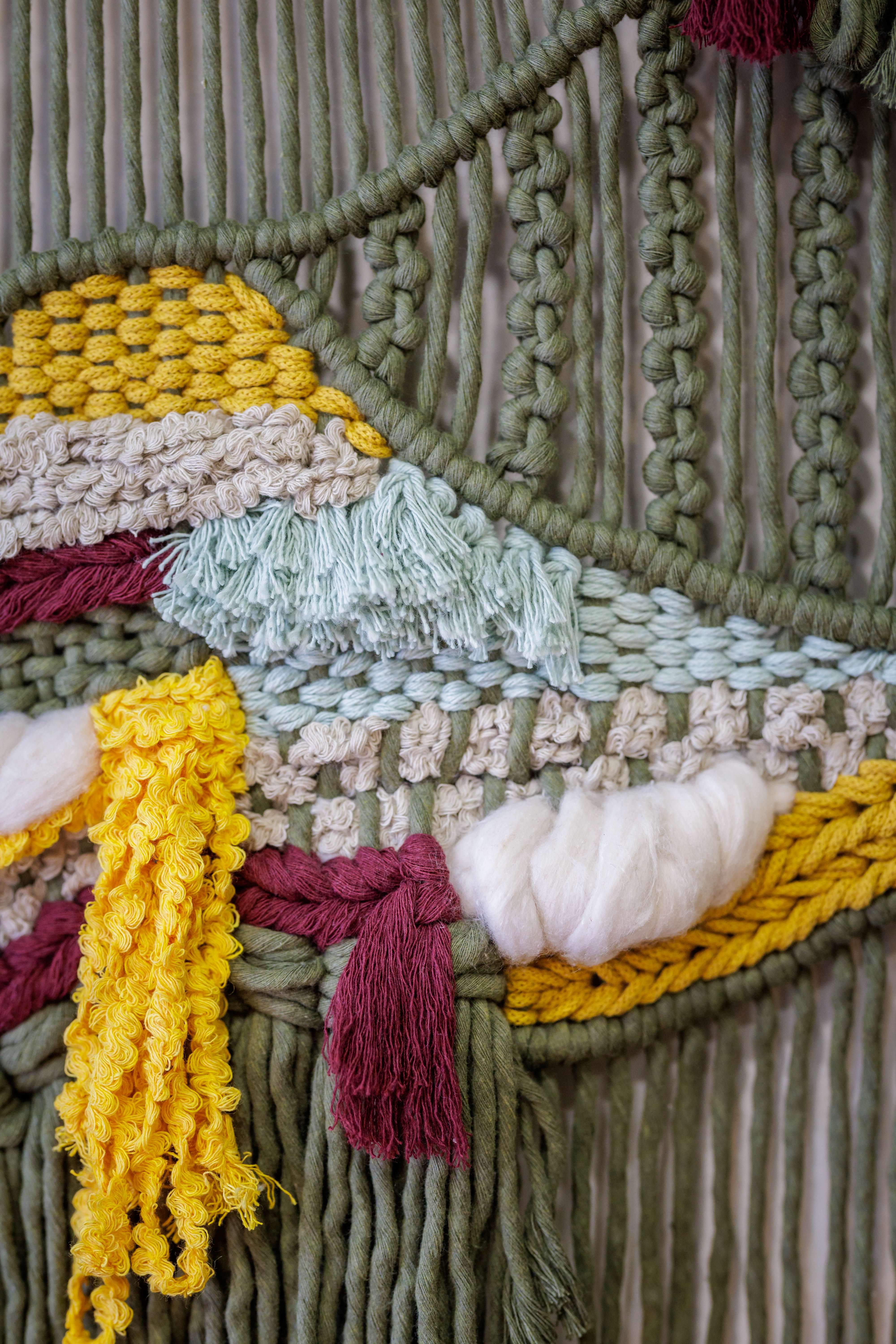“Cada peça é única”, afirma a artesã, que começa o processo criativo com um esboço daquilo que pretende criar, mas admite depois ir construindo a peça de forma muito intuitiva e orgânica, misturando nós e cordas de várias cores, materiais e espessuras para dar diferentes texturas e movimentos ao trabalho, que pode ter as mais diversas inspirações: um jardim, as nuvens, uma paisagem… “Gosto muito de utilizar o macraweave, que é uma técnica que combina o macramé com a tecelagem, e que me permite criar sem regras e simplesmente deixar fluir.”