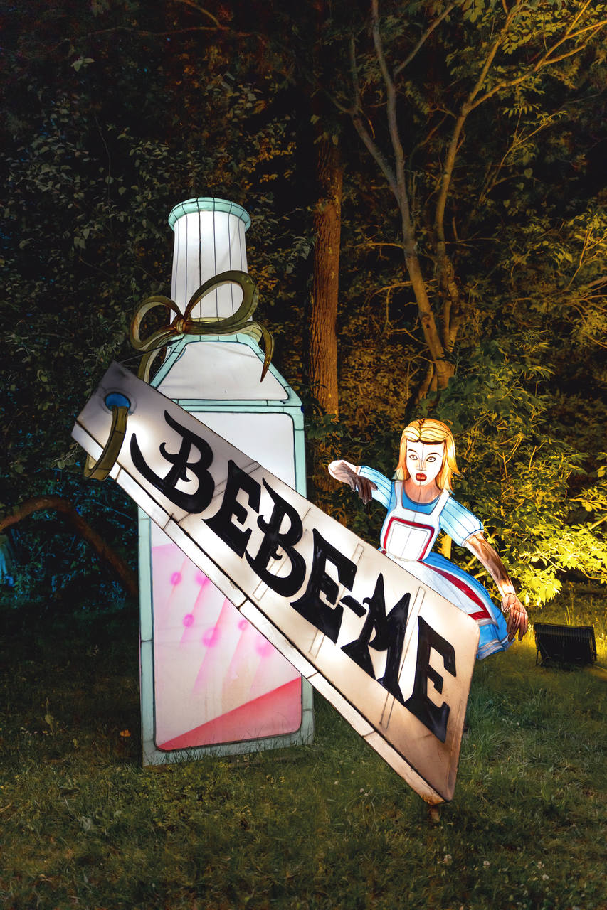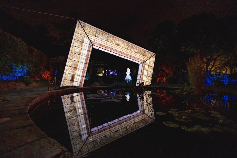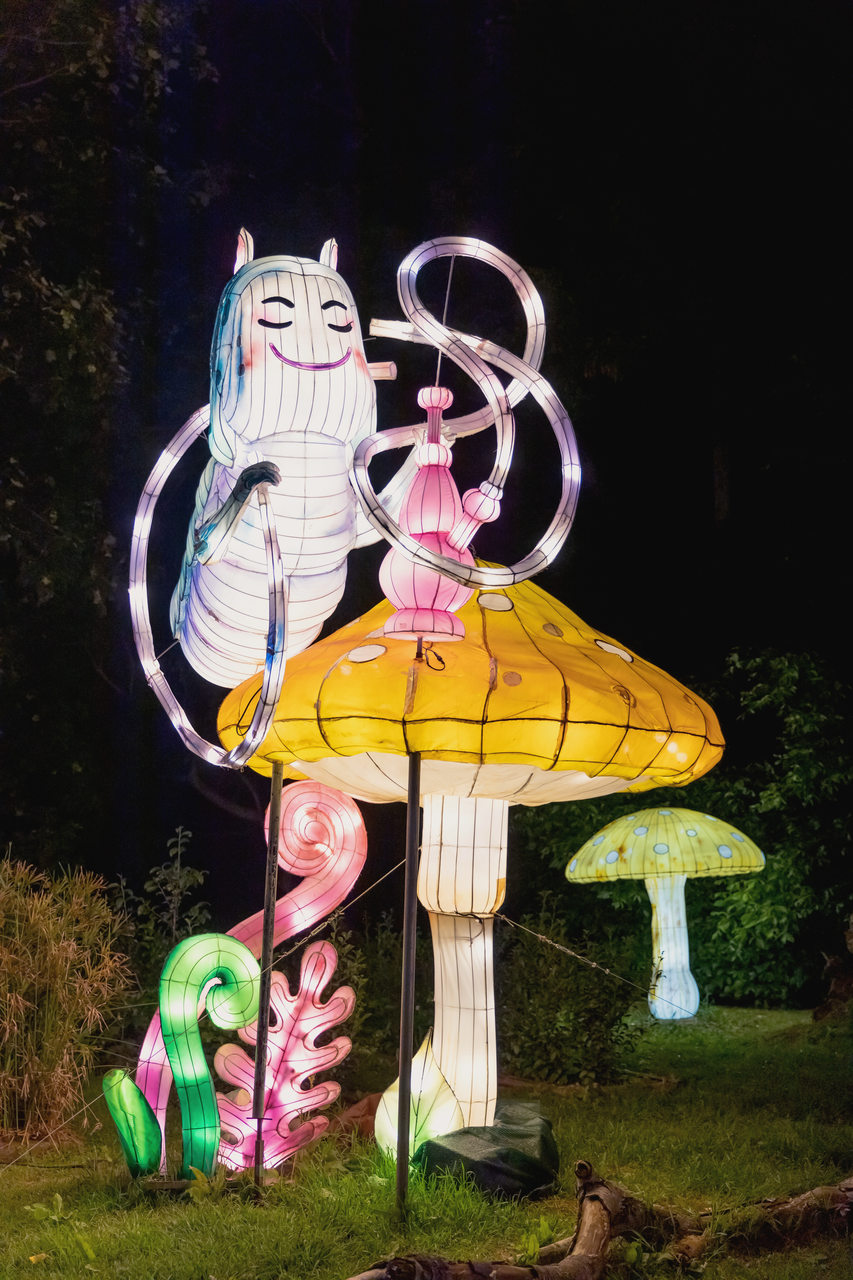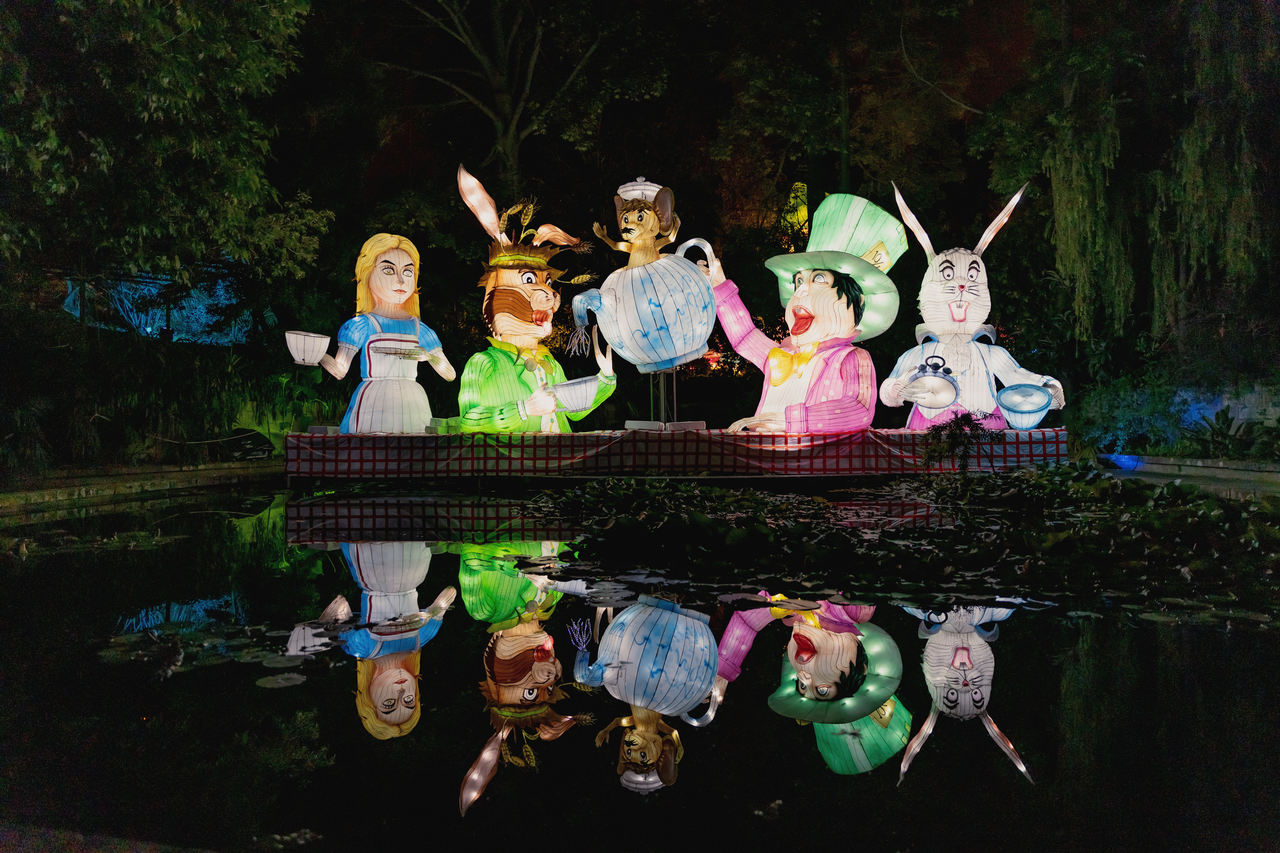 O Coelho Branco, sempre apressado, de relógio em punho; a Lagarta, com o seu cachimbo; o sorridente Gato de Cheshire; e, claro, Alice, a menina que entra num mundo repleto de seres e aventuras inverosímeis. Essas e outras personagens do universo de Carroll surgem representadas ao longo daquele percurso imersivo, que se estende por um quilómetro. O caminho toma apenas um sentido, sendo os visitantes livres de o trilhar durante o tempo que quiserem.
