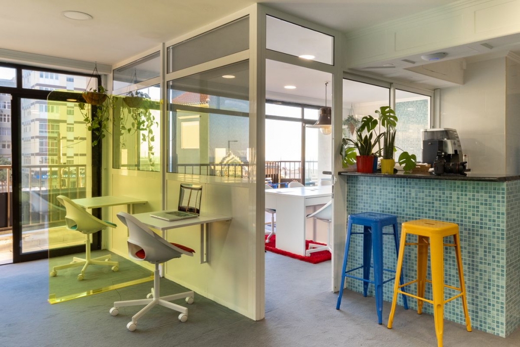 Decorado segundo um certo “minimalismo moderno-industrial”, o espaço tem várias mesas de trabalho – algumas delas privadas, dentro de cubículos de vidro coloridos -, uma sala de reuniões, fotocopiadora e impressora, máquina de café e garante “uma ligação fiável à Internet de alta velocidade”.