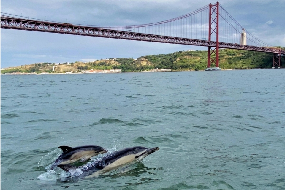 Apesar de não serem residentes no Tejo, os golfinhos são presença habitual desde 2020, entre maio e setembro, época em que chegam ao rio à procura de alimento. A espécie mais avistada são os golfinhos comuns, de cor preta e branca, corpo esguio e bico curto e pontiagudo. Ocasionalmente, também se vê golfinhos-roazes, de tom cinza, que chegam a medir quatro metros e a pesar mais de 400 quilos.