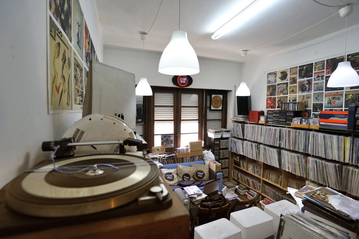 É preciso subir até ao terceiro andar de um prédio na Baixa para chegar a esta loja, um paraíso para os amantes do vinil antigo e de raridades. Nuno Moreira, o proprietário, gosta de conversar sobre música e fá-lo com alegria e conhecimento. O espaço, que funciona como uma sala de estar, com sofá e um gira-discos pronto a usar, promove a interação.