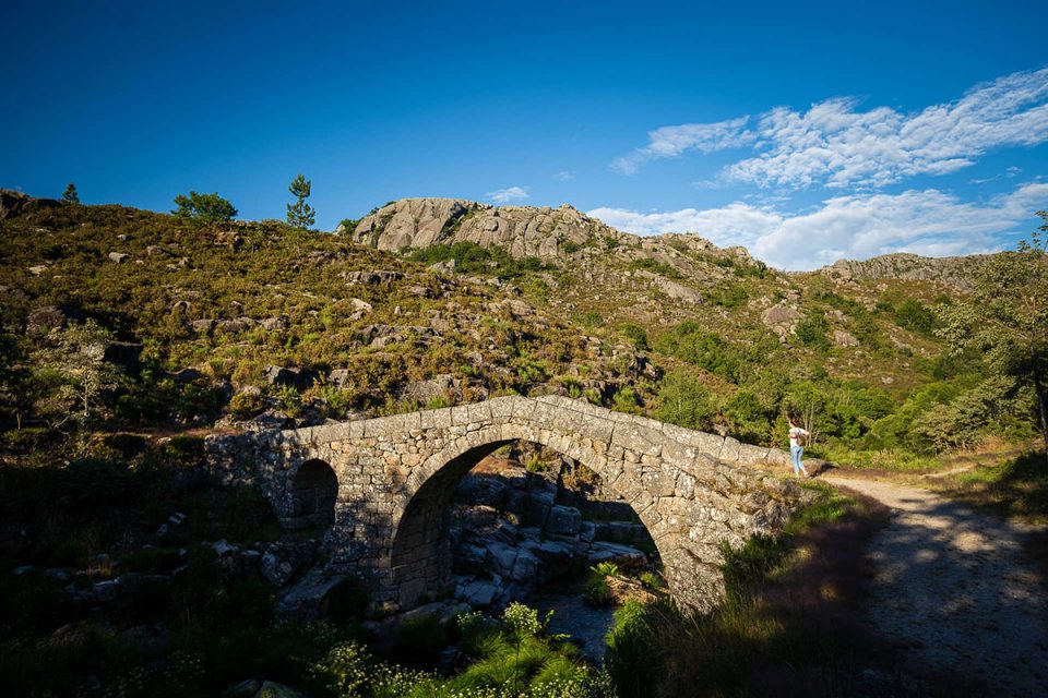 A paisagem bravia da serra, no Parque Nacional da Peneda-Gerês, serve de enquadramento à Ponte Nova, ou Cava da Velha, como também é conhecida.