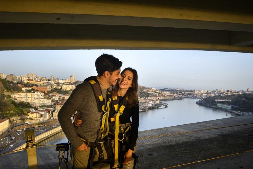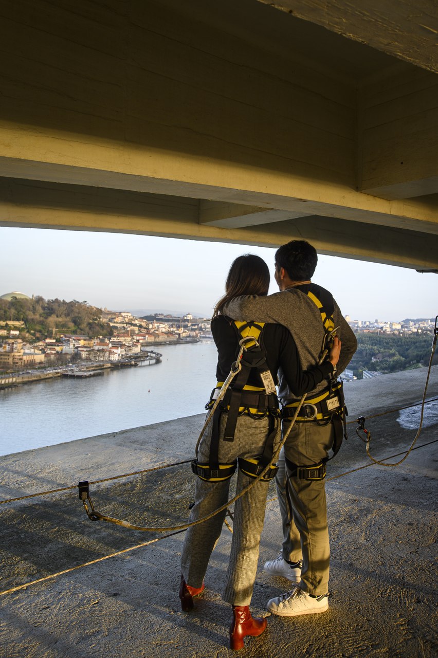 Pode uma subida ao arco da Ponte da Arrábida ser romântica? Sim, tanto que já serviu de cenário a vários pedidos de casamento. Os visitantes vencem os 262 degraus apoiados num corrimão, usando arneses ligados a um cabo de aço, sem pressa, com um guia da Porto Bridge Climb. É uma experiência que nada tem de radical, feita em segurança.
