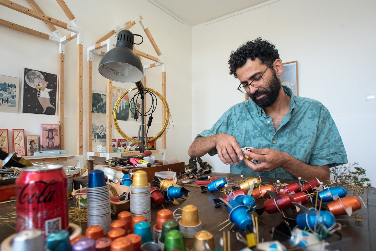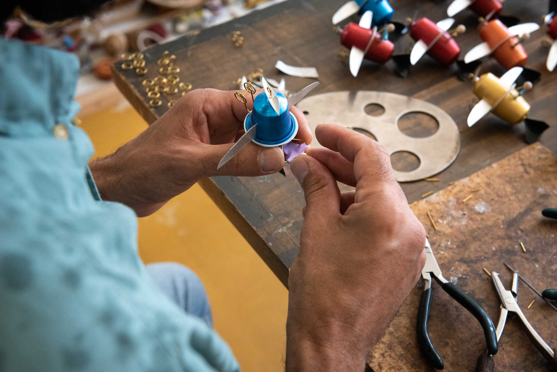 Sobre a mesa repousa um Citroën 2CV nascido de uma lata de atum, os cortes pacientemente feitos com uma tesoura para unhas. Encostada a uma parede está uma peça maior e ainda mais elaborada: a recriação de uma feira popular com movimento, associando elementos como uma máquina de costura salva da sucata, um dínamo de bicicleta comprado na Vandoma, varetas de guarda-chuva, cápsulas de café ou uma lata de bolachas. São dois exemplos de brinquedos construídos com materiais reutilizados no âmbito do projeto Simão Feito à Mão, que tem ateliê no Bonfim.
