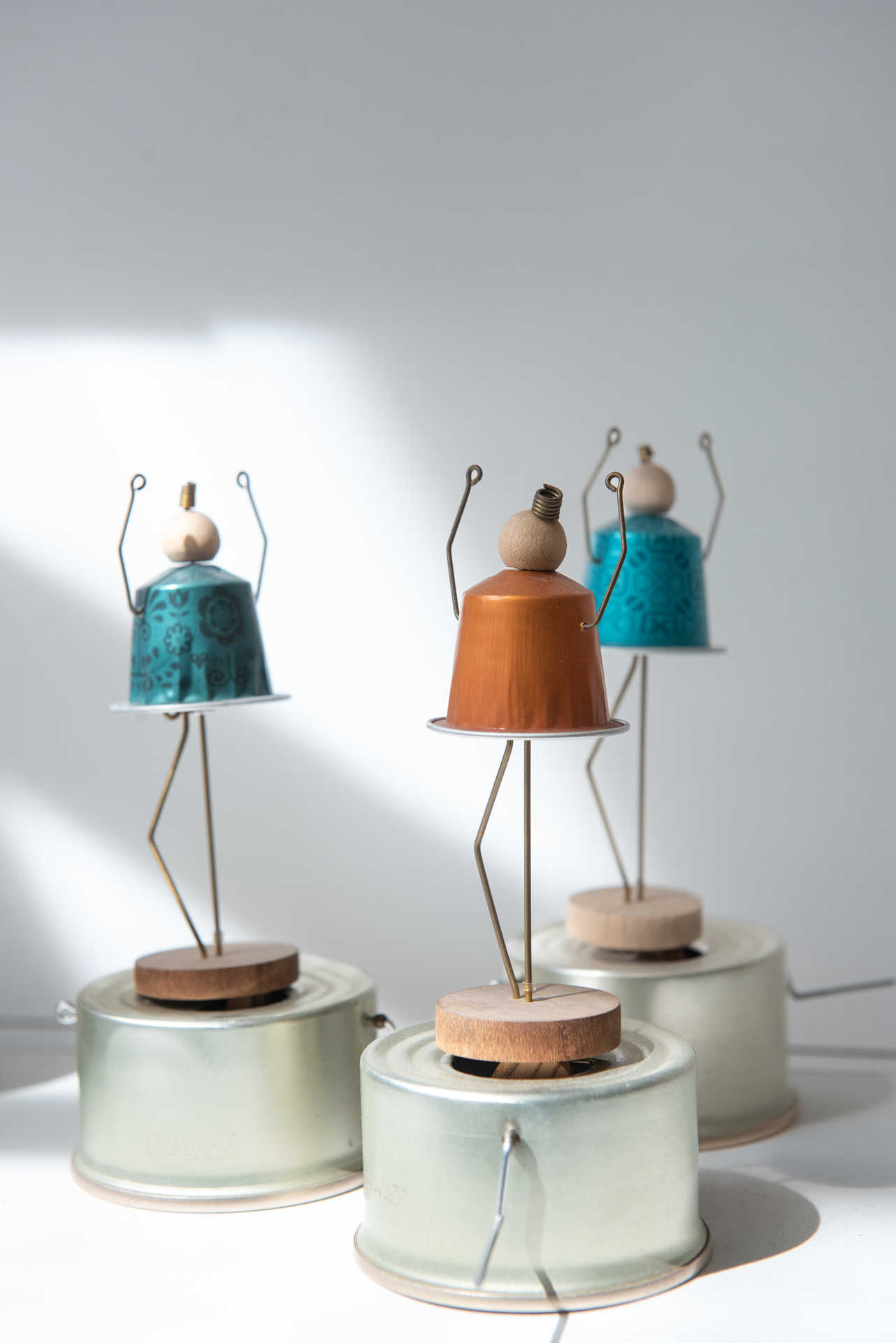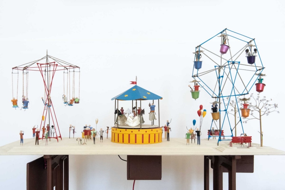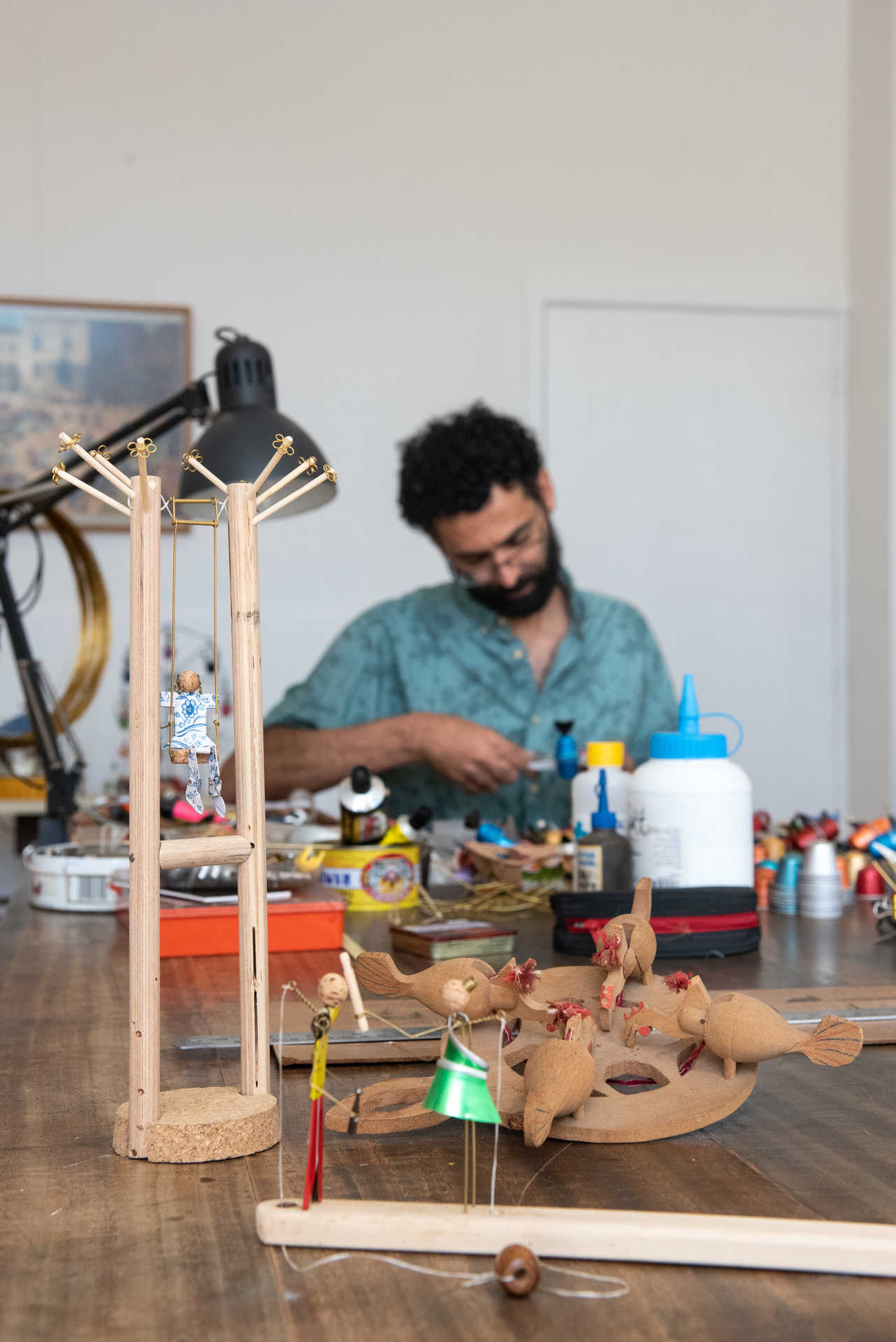 É tudo fruto da criatividade de Simão Bolívar, artesão brasileiro que se formou em geologia, mas queria mesmo era ser naturalista. Acabou rendido ao prazer de criar com as mãos, que lhe estava nas raízes: no Brasil, o pai fazia mamulengo (teatro de bonecos popular), e ensinou-o a construir os primeiros brinquedos tradicionais. Agora, reinterpreta-os e inventa outros, recorrendo a matérias-primas que acabariam no lixo.