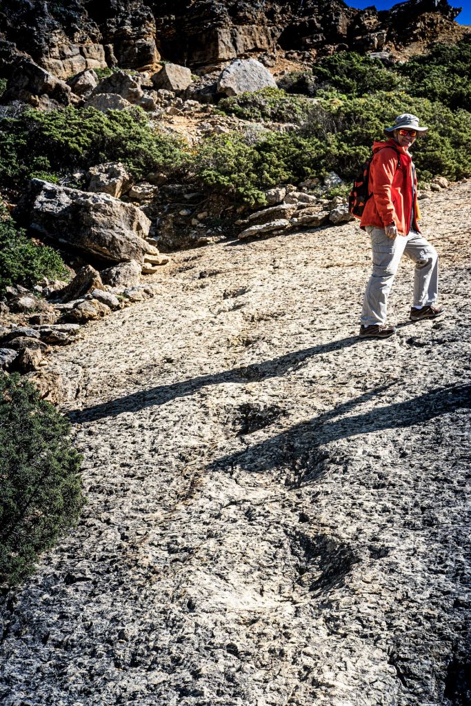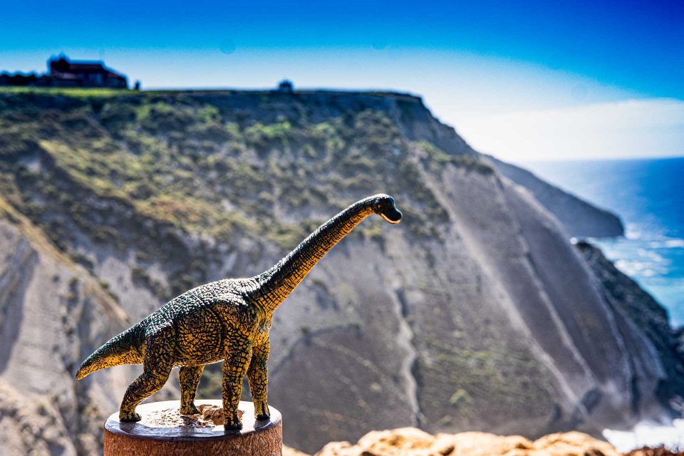 Munida de um dinossauro em boneco, a guia da Sesimbra Safaris ajuda a perceber melhor a forma como os dinossauros terão passado por ali. “As pegadas originam-se com a pressão do animal no terreno pantanoso. Com a sedimentação de areias e sedimentos [ao longo de milhares de anos] foram tapadas, e quando se deu o choque das placas tectónicas [entre os períodos Jurássico e Cretácico], ocorreu a separação, por isso é que as vemos nas lajes com esta inclinação”, explica. As pistas paralelas de pegadas foram “consideradas a primeira evidência de comportamento gregário entre saurópodes reconhecida na Europa”, lê-se relativamente ao Monumento Natural da Pedra da Mua no website do Instituto de Conservação da Natureza e das Florestas.