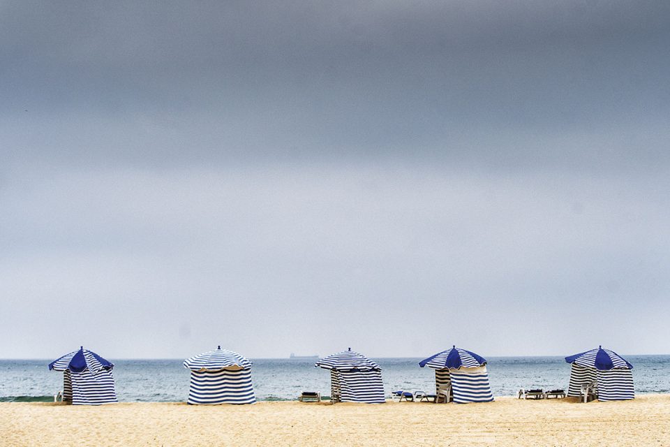 A imagem foi captada na Figueira da Foz, mas bem podia ter sido retirada de um filme gravado no final da década de cinquenta numa praia francesa, algures na fria Bretanha ou na badalada Côte d’Azur. As riscas azuis e brancas remetem-nos para uma qualquer película da Nouvelle Vague, embora sejam também a imagem de marca da costa atlântica portuguesa.