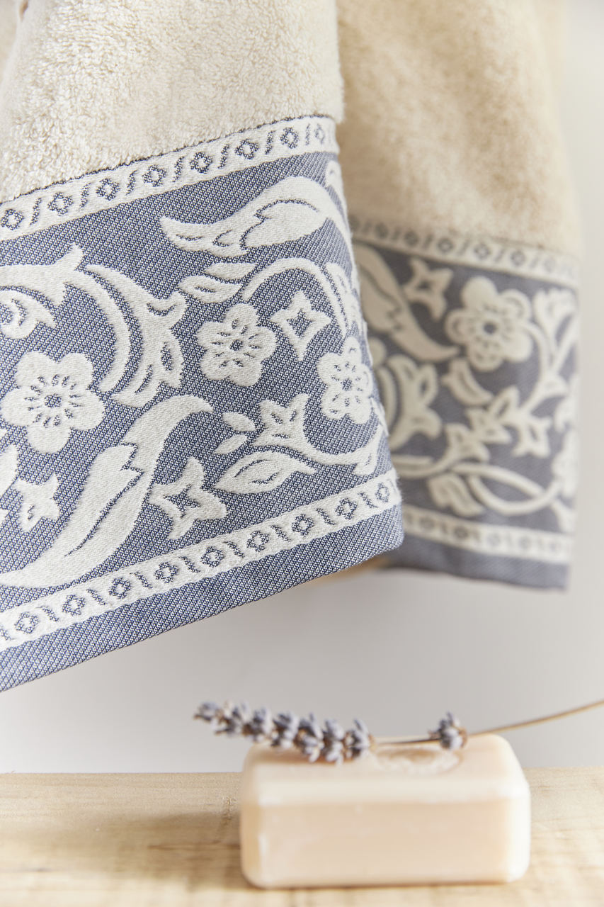 A Torres Novas recuperou várias linhas de toalhas, tapetes e toalhetes, em diversas cores. Mas as toalhas Royale, um clássico da casa, assumem apenas a cor natural – assim designada por ser a do algodão. Afinal, são feitas exclusivamente com essa matéria-prima natural, com uma gramagem de 550 g/m2, apresentando nas extremidades uma barra de fantasia com desenhos inspirados nas paisagens e flores de campo de França, em azul, bege ou bordeaux.