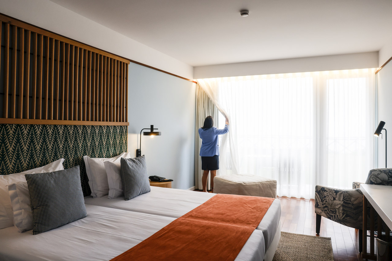 É no topo de uma falésia, na Achada do Gramacho, em Santana, que se ergue este quatro estrelas rodeado de vinhas – ou não estivesse a propriedade de cinco hectares em que se insere dedicada, em parte, à viticultura. O hotel tem uma adega que recebe provas de vinho Madeira, duas piscinas (uma delas entre videiras, aquecida com painéis solares), sauna, sala de fitness, parque infantil e outras valências. Foi remodelado pouco antes de estalar a pandemia, sendo a ala nova composta por 20 quartos com vista oceânica. No total, há 65, de diferentes tipologias, e duas villas.