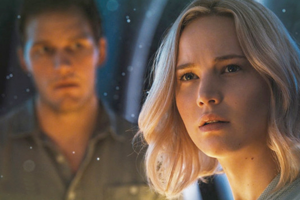 Uma nave espacial tem um problema técnico e dois passageiros acordam 90 anos antes da chegada ao seu destino.