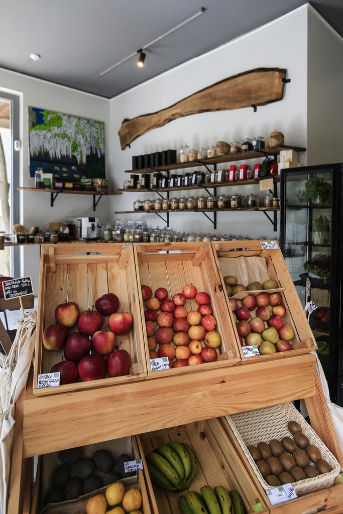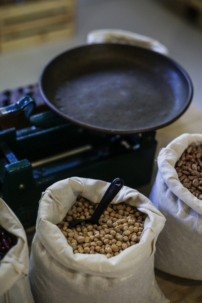 A ocupar uma das paredes da loja, numa estrutura em madeira, encontra-se um correr de frascos, perfeitamente alinhados, cheios com farinhas, amidos, cacau em diversas formas, levedura nutricional, cereais e sementes, vários tipos de soja, diversas lentilhas, arroz negro, vermelho e selvagem, massa a granel, frutos secos e fruta desidratada. Destacados estão os feijões – branco, preto, vermelho, catarino, fradinho, manteiga e até o esquecido papo de rola. Já embalado, há bolachas, gomas, chocolates, bebidas vegetais, azeites, compotas, pastas, snacks salgados e produtos de higiene, e ainda dois frigoríficos com “queijos”, “alheiras” tofu e seitan, kombucha, cerveja e refeições prontas – tudo vegano.
