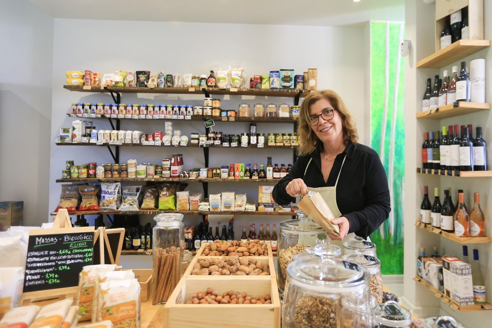 Atualmente, é Teresa Guerra que recebe quem entra nesta loja com morada na Avenida Dr. Antunes Guimarães, perpendicular à Avenida da Boavista. Mas há mais envolvidos neste projeto, que arrancou em janeiro do ano passado, aquando do regresso a Portugal de Tiago, o filho, e dos sobrinhos e irmãos Diogo e Mariana. “Eles são muito virados para a sustentabilidade, e acreditam que não chega falar [sobre ela], é preciso fazer”, começa por contar Teresa – que aceitou este desafio depois de ficar desempregada durante a pandemia -, antes de apresentar a oferta, tão grande e diversificada, que seria capaz de fazer corar alguns supermercados. Antes mesmo de se entrar na mercearia, um cavalete de ardósia a porta faz saber o que há de fresco. No dia da visita, havia pão e focaccia de fermentação lenta, fruta e legumes de produtores locais e, sempre que possível, biológicos.