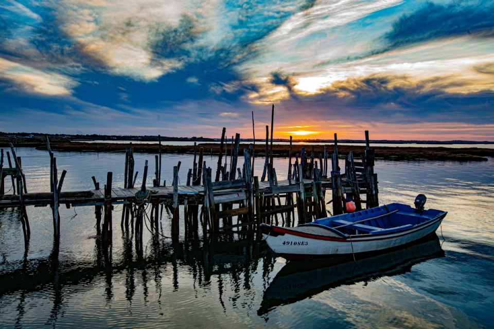À hora do lusco-fusco reinam o silêncio e a contemplação: tem lugar o sibilar do vento e o grasnar das garças e gaivotas. O pôr do sol tinge as águas de laranja e cor de rosa. Estamos no Cais Palafítico da Carrasqueira, uma obra-prima da arquitetura popular, na freguesia da Comporta, em Alcácer do Sal, e um dos locais mais procurados para assistir ao pôr do sol.