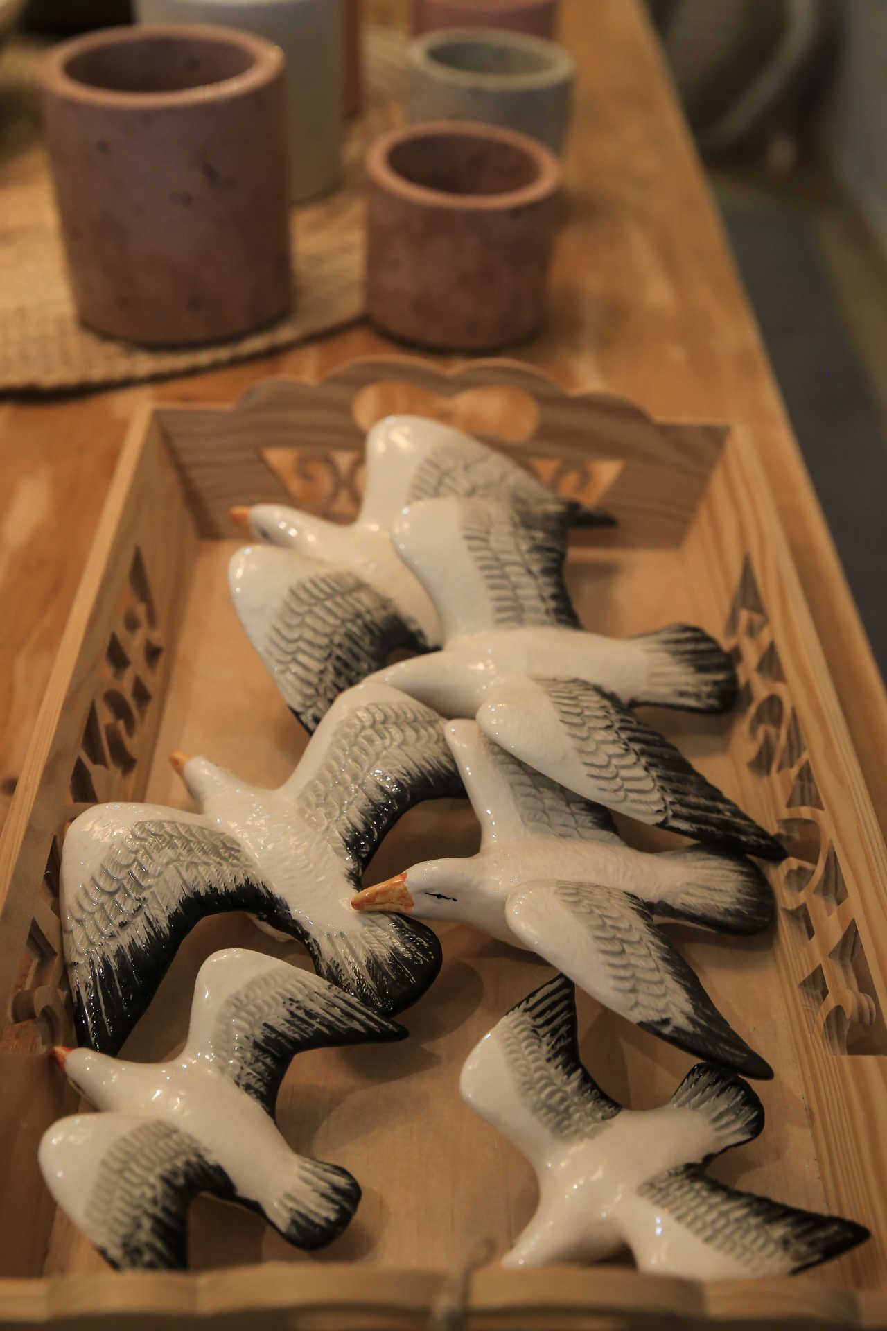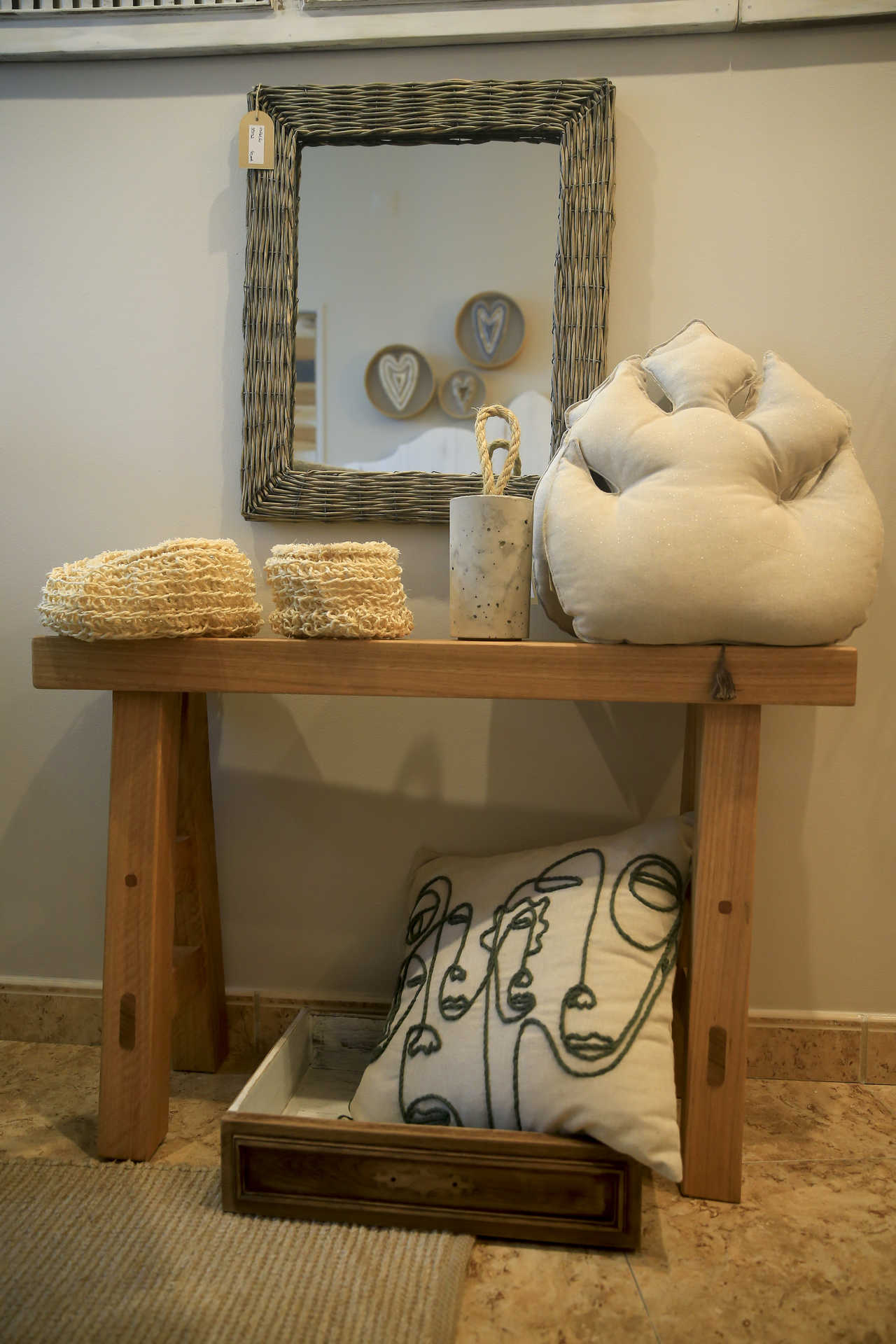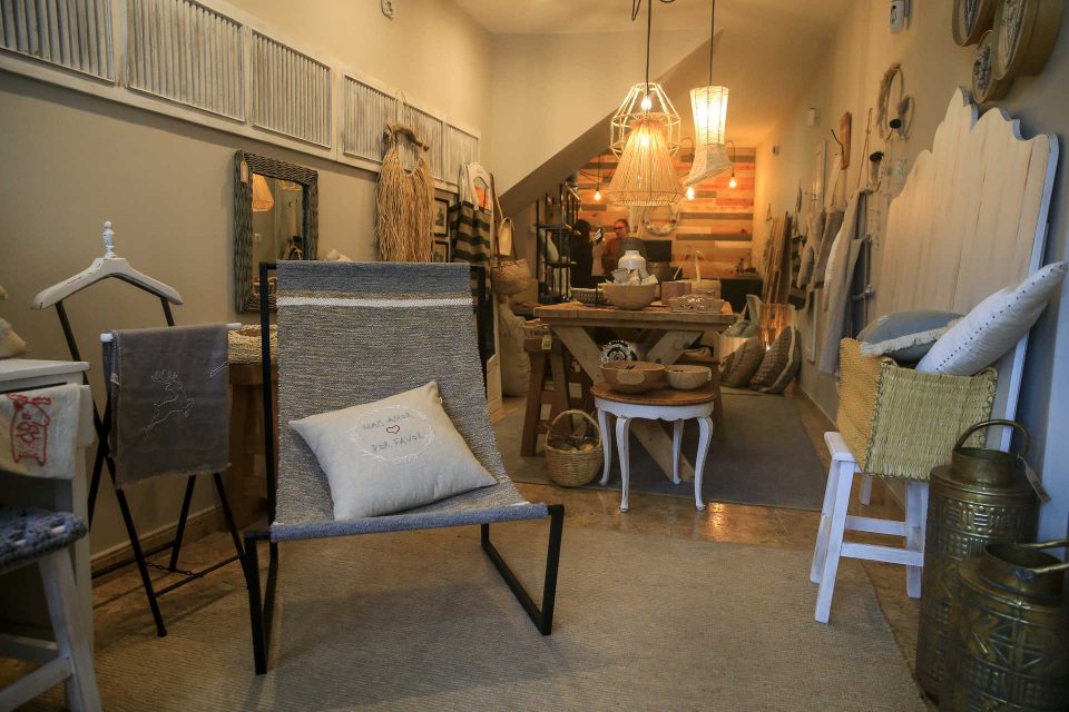 Os têxteis são uma presença forte na loja, que dispensa materiais sintéticos. Há artesanato tradicional, cestaria, tapetes manuais, sem perder de vista um lado mais contemporâneo. Dá nas vistas a cadeira que incorpora trabalho manual, em estilo tapete ou cabedal. Produtos artesanais em linho, como os caminhos de mesa, têm bastante saída. Há sacos 100% de algodão, gaivotas de cerâmica, candeeiros de ráfia ou de sisal, peneiras decorativas que também funcionam como luminárias (com lâmpadas LED), alguns móveis recuperados e peças vintage.