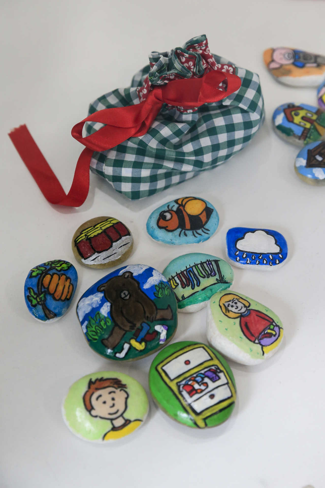 Uma das sugestões em loja é o saco de histórias: lá dentro colocam-se pedras pintadas com diferentes motivos, que dão azo a uma história sempre diferente, à medida que são tiradas. Este jogo permite várias leituras. Pode-se pedir aos mais novos que descrevam o que veem nas pedras e criem a sua narrativa, ou que façam uma redação.