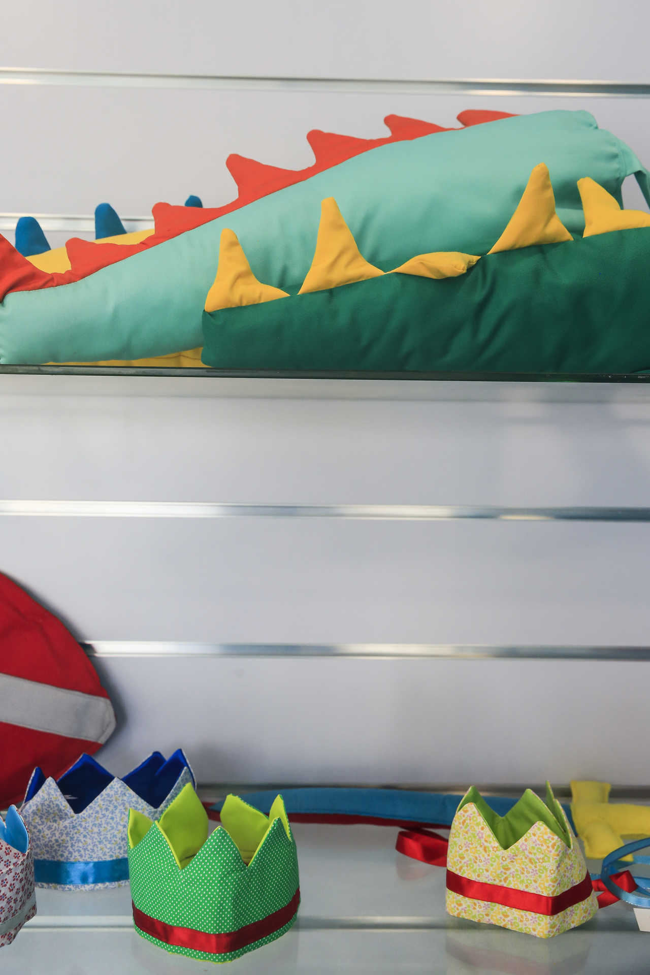 A Nau das Artes tem vários artigos a pensar nos miúdos, como coroas e caudas de dinossauro de prender à cintura, em tecido – disfarces reutilizáveis no Carnaval, e não só. Há ainda raposas e cavalos de madeira, feitos por um amigo que também cria jogos com aquele material. Esses já se destinam a crianças e adultos, tal como outras propostas: porta-sandes, aventais, bolsas ou acessórios de cabelo.