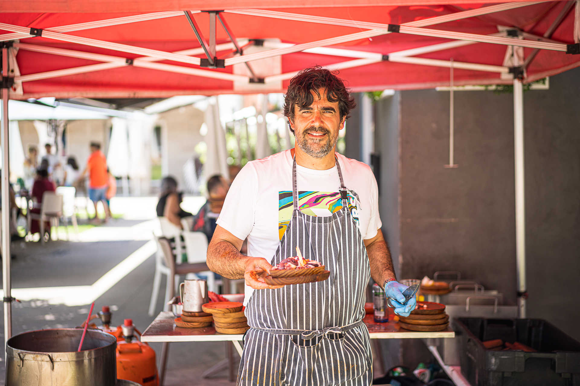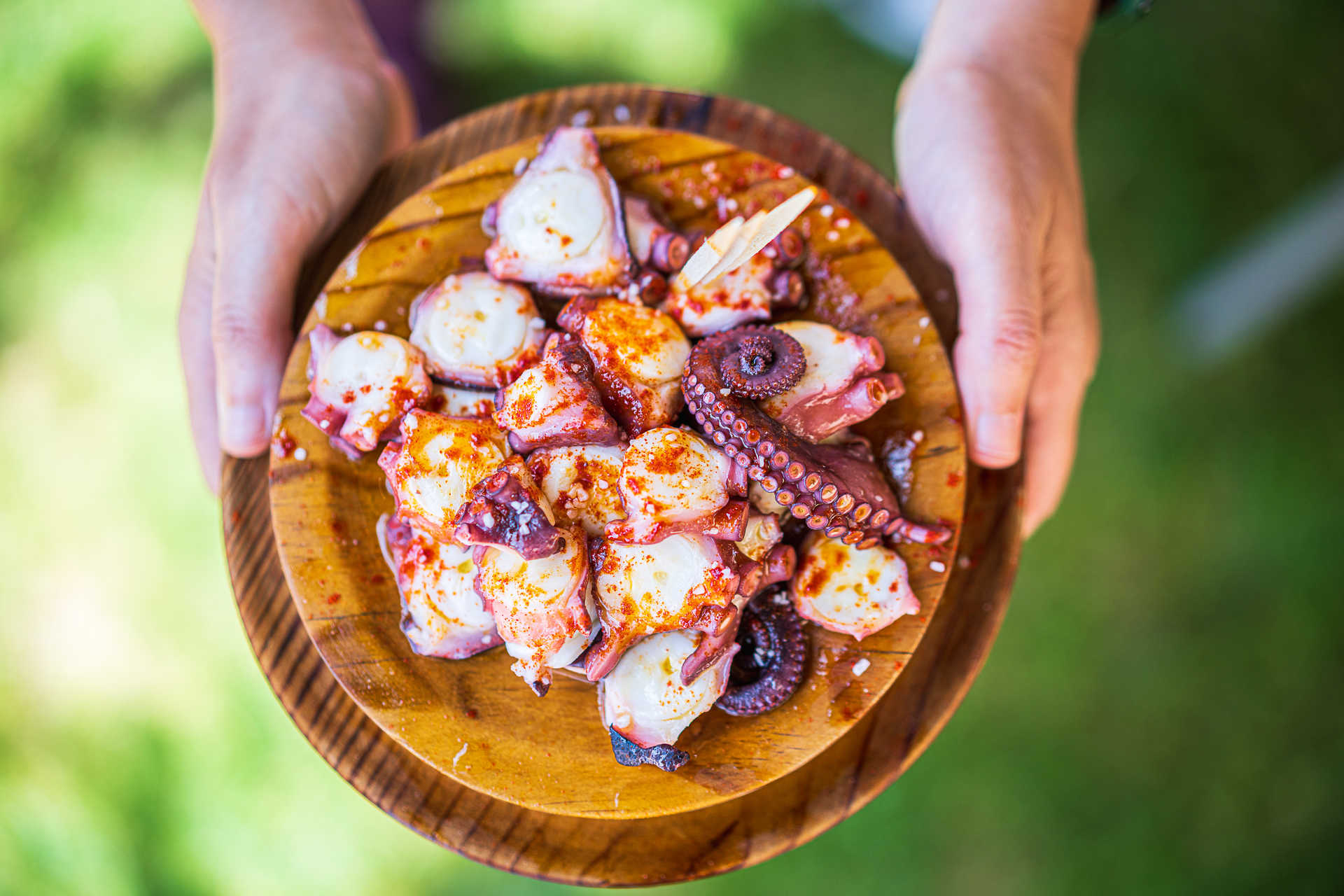 É que todas as semanas, Lolo cumpre uma tradição galega de preparar o polvo à feira numa banca de rua. Os polvos são cozidos em grandes panelas, depois cortados e temperados com paprica, sal grosso e azeite. Durante a hora do almoço, Lolo, que é natural de Tui e pulpeiro há 15 anos, não tem um momento de descanso. “Por semana sirvo uns 300 quilos de polvo”, conta. O pulpeiro ambulante diz que não há nenhum truque para o polvo ficar no ponto, “só prática”. As bebidas para acompanhar as tábuas de polvo pedem-se no Entresons. Nos restantes dias, anda por outras vilas da Galiza (quintas, sextas e sábados em Mos e domingos em Tui).