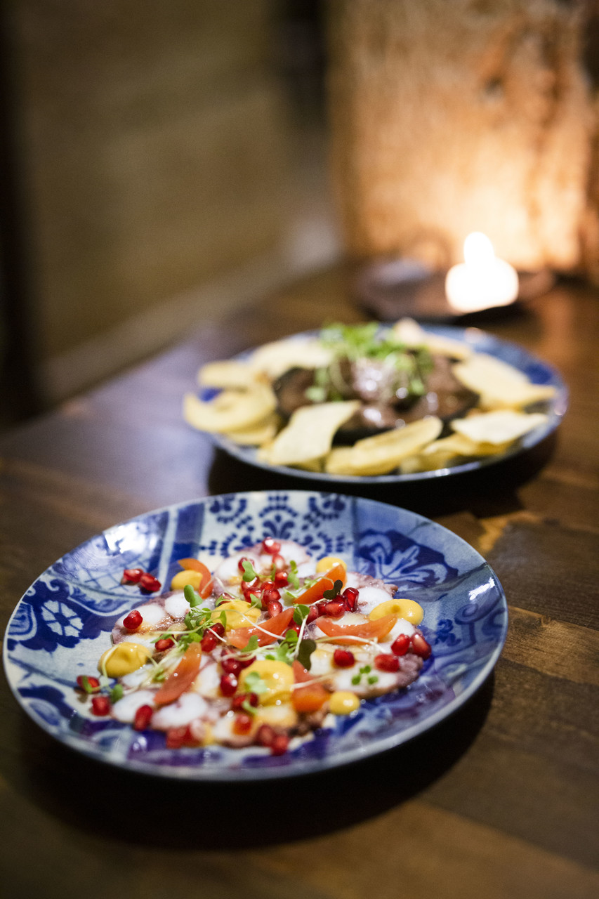 Nos pratos que entraram agora na carta, reinventa-se um pouco a tradição. “Não deixa de ser uma cozinha de sabores tradicionais, mas tem um pouco da minha história e da história do João. É impossível fazer uma cozinha tradicional crua e dura, não é a nossa essência de cozinha. Usamos os sabores tradicionais, os elementos estão lá, mas com um twist”. Fábio foi buscar sabores às suas memórias de infância (os pais vieram de Angola). “Estamos a falar de pequenos apontamentos que remetem para África, mas não vou fazer uma muamba, faço cozinha portuguesa e de autor”. Um carpaccio de polvo com chips de banana-pão, um pica pau de javali com mandioca frita, ou uma sobremesa com gelado de múcua são alguns dos exemplos.