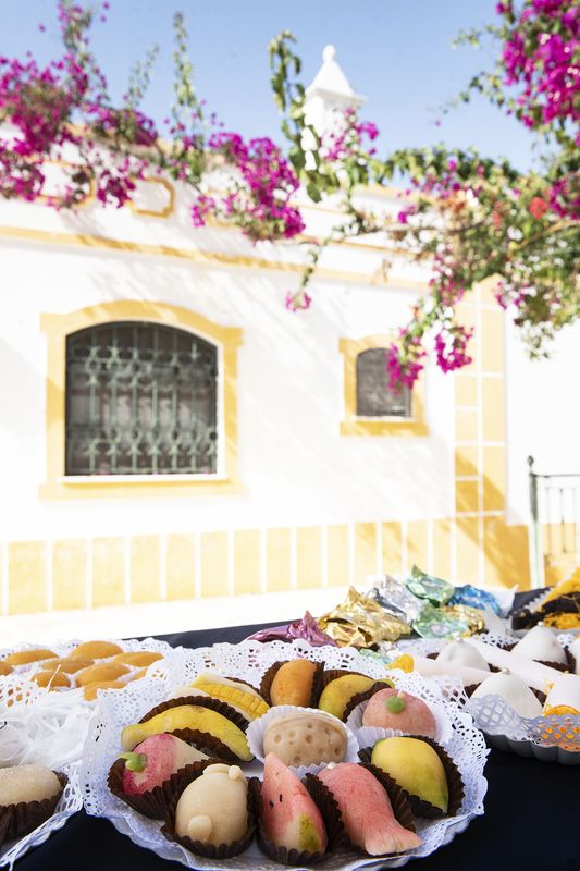 Maria Encarnação, de 72 anos e estatura frágil, surge de avental ao fundo da sala da casa de chá e aproxima-se do vidro para se fazer ouvir sobre a máscara que lhe cobre o rosto. É assim desde que a pandemia a obrigou a encerrar ao público o estabelecimento onde fabrica e vende os doces conventuais e regionais, na QUINTA DO AVÓS, em Algoz. Mas não se atrapalhou: para continuar o negócio a vender para fora, cobriu o espaço entre as montras com madeira e deixou aberturas estreitas para passar as encomendas e o dinheiro aos clientes, não vá o Diabo do vírus tecê-las.