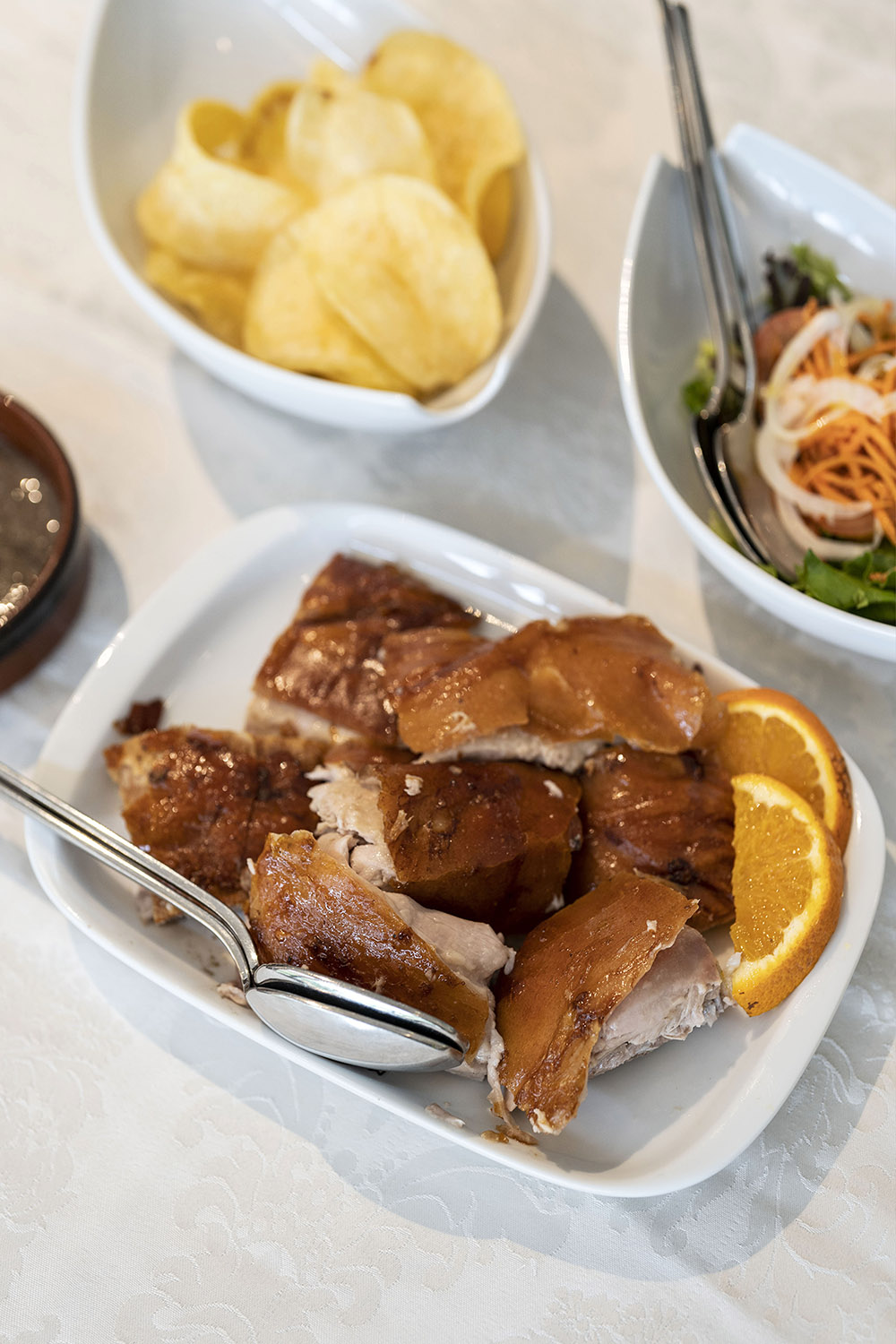 Zita Freire e Bruno Figueiredo têm escrito muitas páginas de inovação a partir da Batalha, ao leme daquele Mosteiro, desde há 15 anos. Mas foi em 2015 que ela deixou o serviço social para se dedicar (também) ao negócio do marido. Assim se explica a preocupação com com a inclusão, que lhes tem valido distinções, nomeadamente do Turismo de Portugal. Porém, o que faz a maioria dos clientes nacionais (e estrangeiros) ir e voltar é quase sempre o leitão, de produção própria, o malhado de Alcobaça. “Tem gordura q.b., pele estaladiça, e é assado aqui, em fornos de lenha, à vista dos clientes. Todo o processo é transparente”, conta Zita, que incentiva os clientes a acompanharem e fotografarem. Acompanha sempre com batata frita, risoto de cogumelos e salada. Um segredo? “Não é muito temperado nem picante. É aquele leitão que até as crianças podem comer”, explica. Porém, há muito mais para provar no Mosteiro, como a entrada de queijo, mel e nozes com bagas goji, uma trouxa em cama de salada. Ou as tentadoras sobremesas. Da extensa carta, vale a pena destacar duas sugestões: a mousse de chocolate com frutos secos e caramelo salgado, e o mil-folhas crocante de mirtilos. A vertente inclusiva do Mosteiro (cujas cartas estão em braile e incluem pictogramas) já mereceu uma tese por parte de um aluno do Politécnico de Leiria.