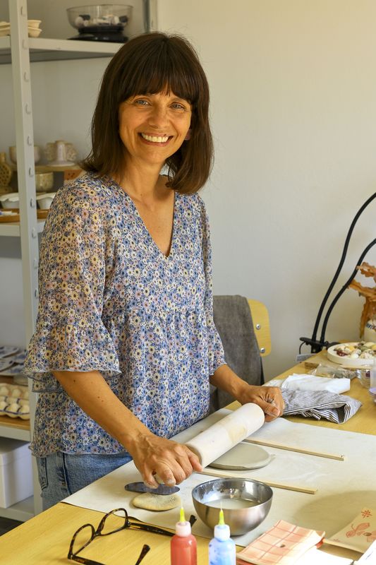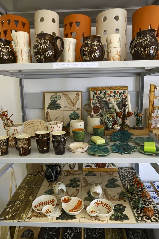 Muito diferentes das panelas, alguidares, púcaros e alcatruzes produzidos noutros tempos são as peças das três ceramistas residentes nas OFICINAS DE CERÂMICA, uma extensão viva do museu. “Fazer cerâmica é muito meditativo”, considera Luísa Benedy, que começou a modelar barro em casa quando a pandemia a impediu de organizar eventos empresariais. Aprendidas as técnicas básicas e somados alguns workshops, criou a marca Mona_Estudio, de venda de peças decorativas ou utilitárias, em grés e porcelana. Saboneteiras, taças e peças de joalharia como brincos e anéis inspirados em formas naturais. “Ainda estou a tentar encontrar o meu lugar”, reconhece. Noutro ponto da oficina trabalha Clémence Thiollier, francesa que diz ter encontrado no Alentejo “pessoas muito tranquilas”. Sentada numa roda de oleiro elétrica, também produz peças decorativas e utilitárias, em barro vermelho que, tal como as de Luísa, refletem a estética e funcionalidade que a olaria mantém.