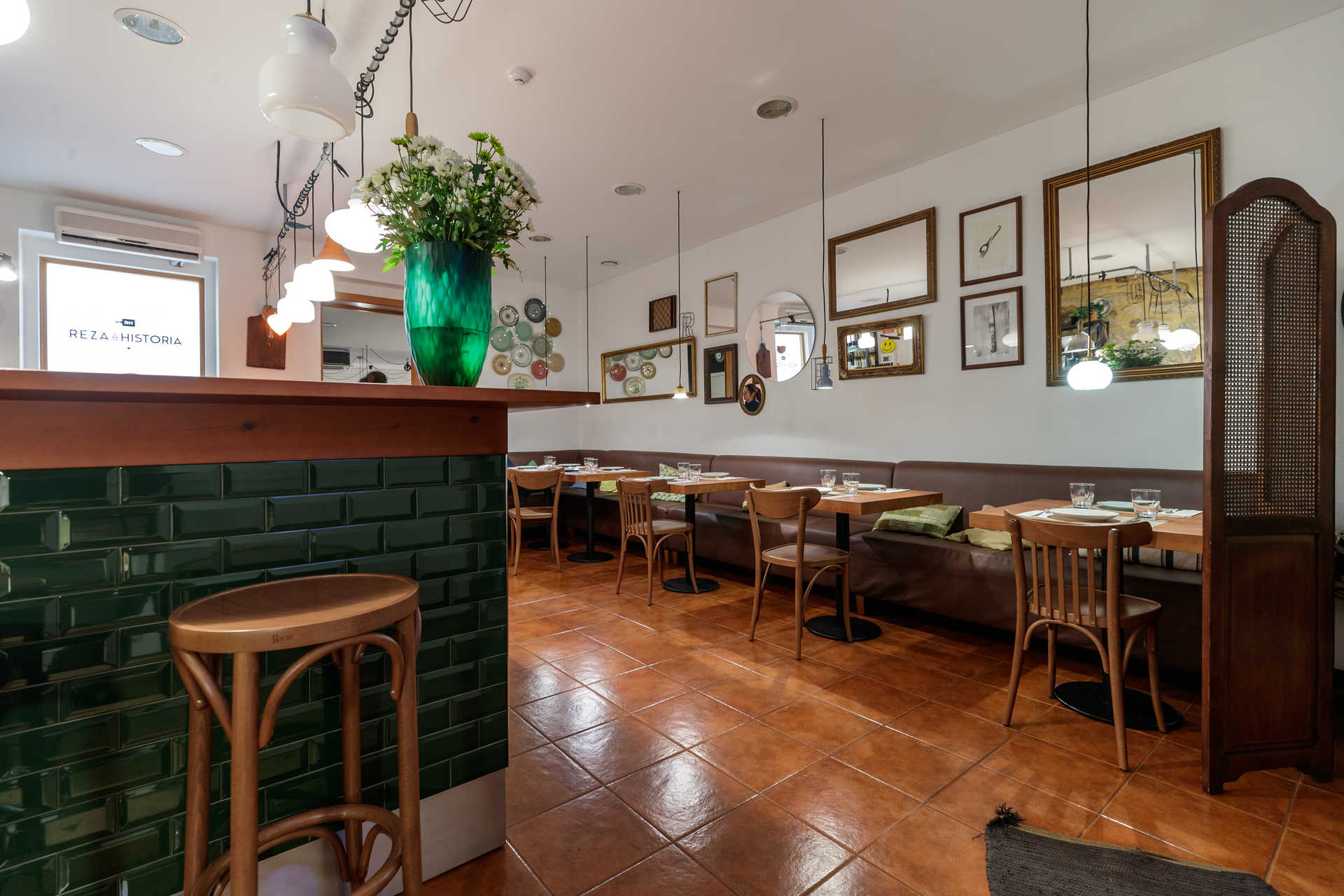 Na freguesia vizinha, Nine, encontra-se outro negócio familiar. Uma cozinha inesperada, sem pretensiosismos, escondida numa pequena casa na Rua da Igreja – o que leva a supor a razão do nome -, e que prima pela simplicidade. Já se tornou lugar de peregrinação e ao fim de semana só é certo arranjar mesa com reserva. Chama-se Reza a História, “porque quando fazemos um prato vamos buscar as raízes da receita, mas também damos o nosso toque”, explica Sílvia Ferreira, ao leme do restaurante, juntamente com o marido, Paulo Araujo. Ele na cozinha e ela ao serviço, ainda que tenha também a seu cargo a confeção das sobremesas (entre elas uma deliciosa pavlova).