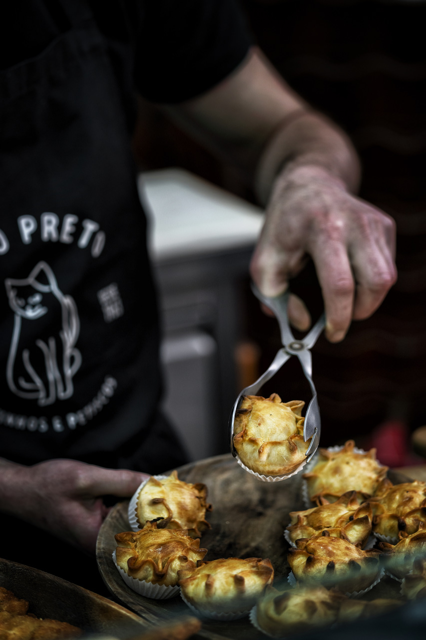 Diariamente, há 13 petiscos para saborear na rua. Pode ser sardinha de pijama (aberta e panada), ossos do pernil ou frango frito com mel e mostarda; sem esquecer as empadas Bem Boas, negócio que Pedro já tinha quando ficou com o Gato Preto. Existe prato do dia, opção vegetariana improvisa-se. Algumas coisas, no entanto, faz por manter – como a decoração castiça e a ausência de televisão e de contacto telefónico.
