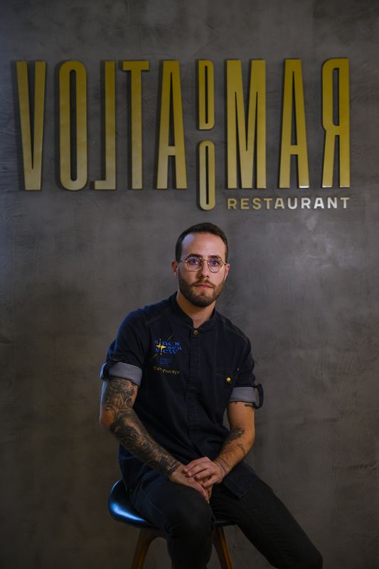 Ao cabo de um percurso que o levou a trabalhar no Ritz e no Alentejo Marmóris Hotel & Spa, entre outros, o profissional de 32 anos propôs-se apresentar no VOLTA DO MAR a cozinha alentejana com influência marítima. “Muitos dos pratos levam algas, como alface do mar, salicórnia e codium, que utilizo também para enriquecer caldos e molhos”, diz. Nas
