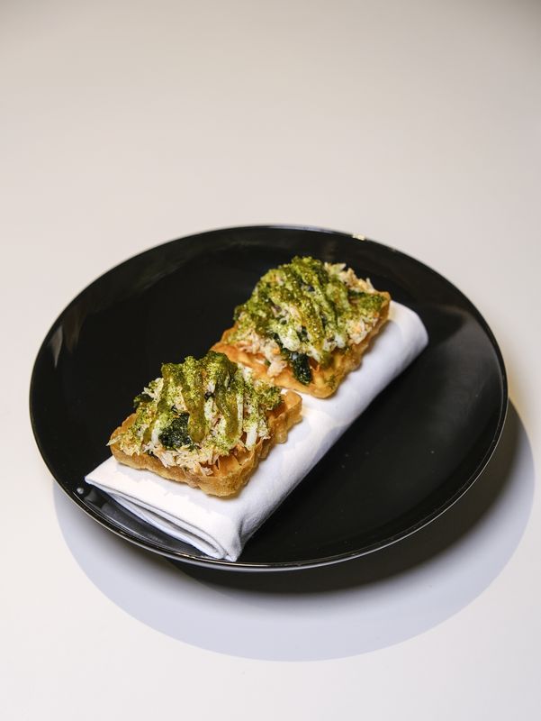 entradas, a filhós de sapateira com maionese de alho, alface do mar e pickle de palma de figo é um bom exemplo da linha do chef. “Pratos simples, com sabor e boa apresentação”.