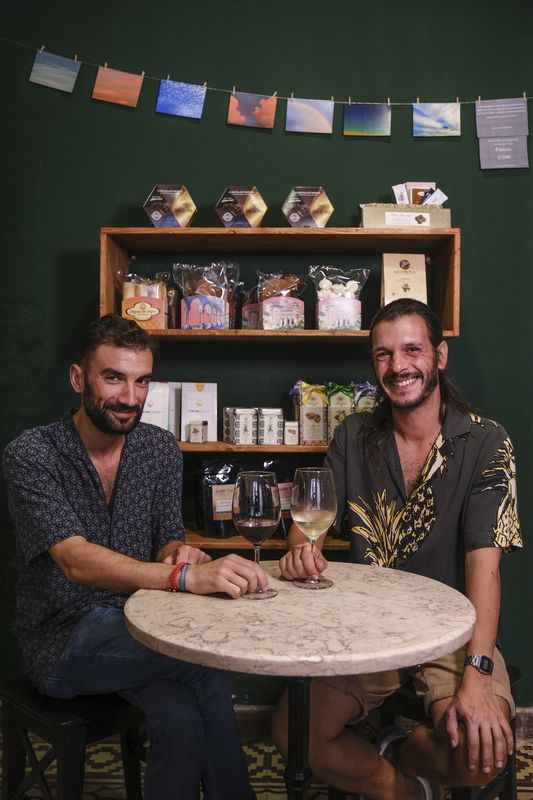 Uns partem, outros estão de passagem, e há quem regresse. Foi o caso de Frederico Salvador e Rúben Pereira, de 36 e 31 anos. Filhos da terra e com as vidas estabilizadas como diretor de produção no Teatro do Mar e eletricista numa empresa petroquímica, respetivamente, regressaram há seis anos para dinamizar a vida no centro histórico. Na MERCEARIA 27, mobilada com estética vintage, o casal vende produtos nacionais, serve petiscos, vinhos e sangrias e também organiza eventos, como concertos intimistas.