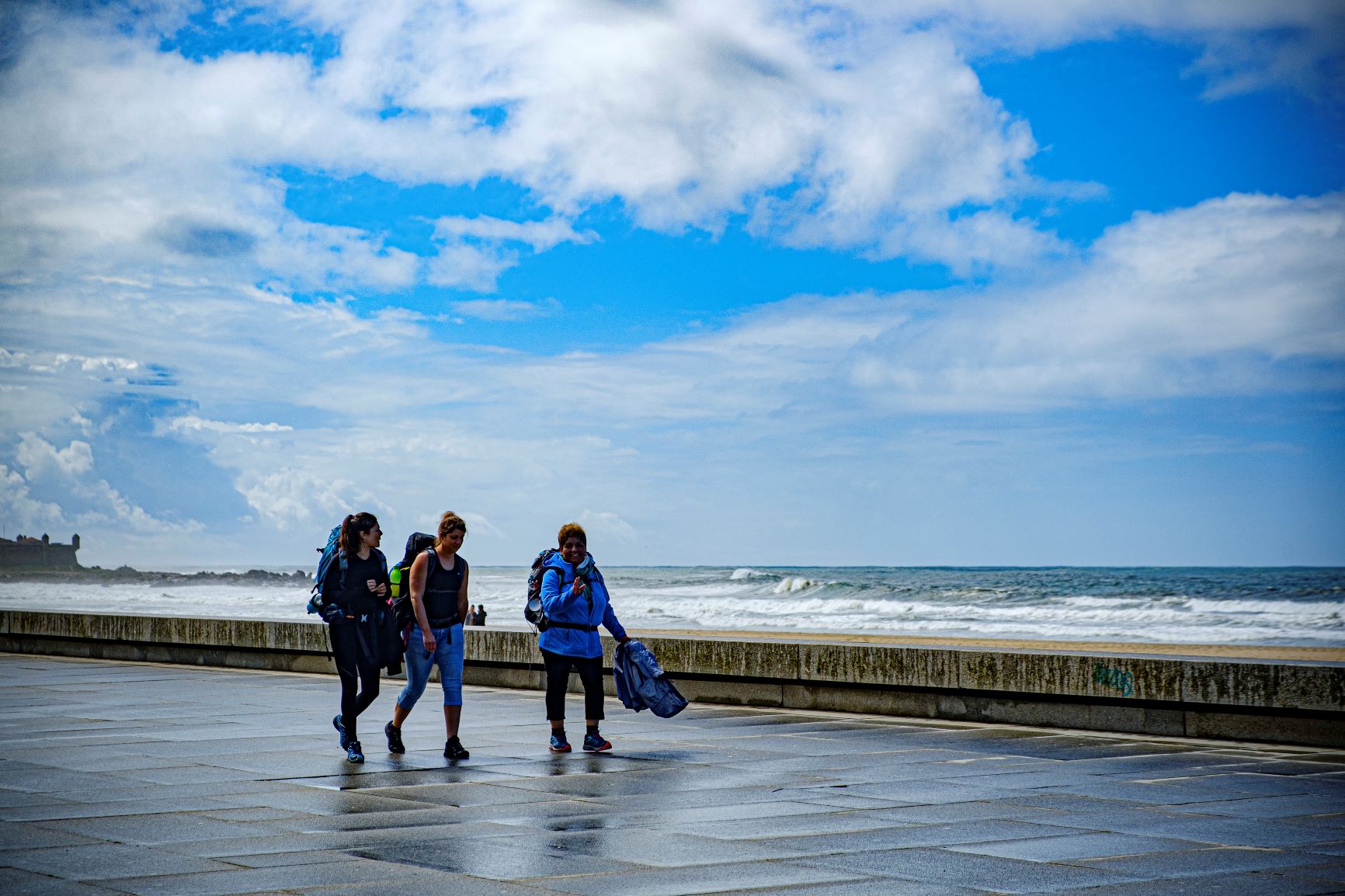 Não faz parte do percurso oficial, que passa pelo interior da cidade, mas atraídos pelo mar, são muitos os peregrinos que seguem pela marginal de Matosinhos, com a maresia e a rebentação das ondas a embalar a marcha. Há um grupo a caminhar no areal, logo pela manhã. Nilda e Martina (mãe e filha da Croácia, a viver na Alemanha), conheceram Yvone e Julia (mãe e filha alemãs) na praia, minutos antes, e vêm a conversar. É a primeira vez que todas fazem o caminho, motivadas pela aventura.