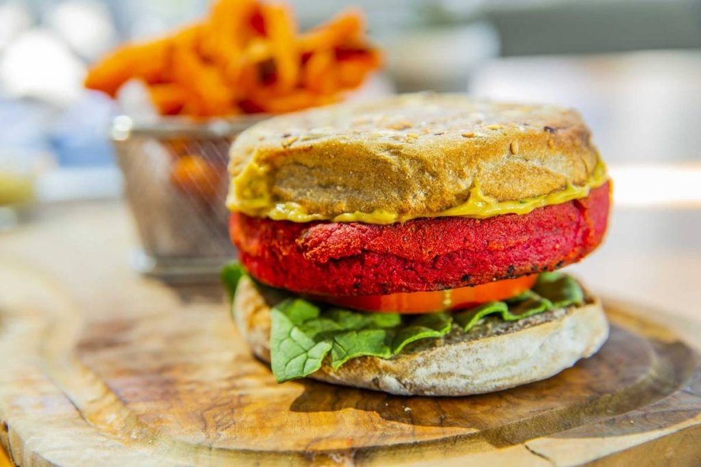 - Este hambúrguer de beterraba é um dos pratos da carta. (Fotografia de Reinaldo Rodrigues/GI)