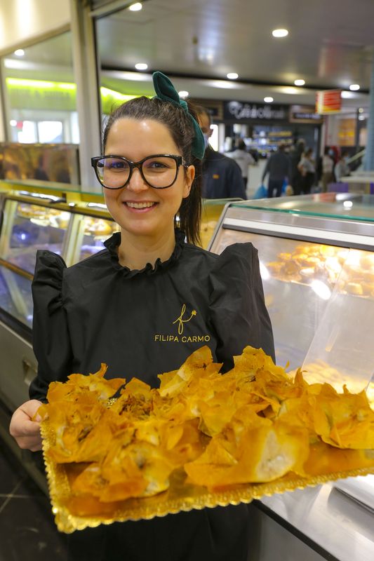 “Teria sempre de ser um doce com produtos vendidos diariamente no mercado, então lembrei-me de juntar a laranja e a amêndoa para criar o FILÓ DA PRAÇA”, conta a farense Filipa Carmo, chef de pastelaria do hotel Conrad Algarve, convidada para criar o doce comemorativo dos 15 anos da praça. “É um crocante de massa filó, amêndoa e compota de laranja cem por cento vegetal”, acrescenta, visivelmente satisfeita com o resultado. O doce é vendido unicamente no mercado, a 1,50 euros.