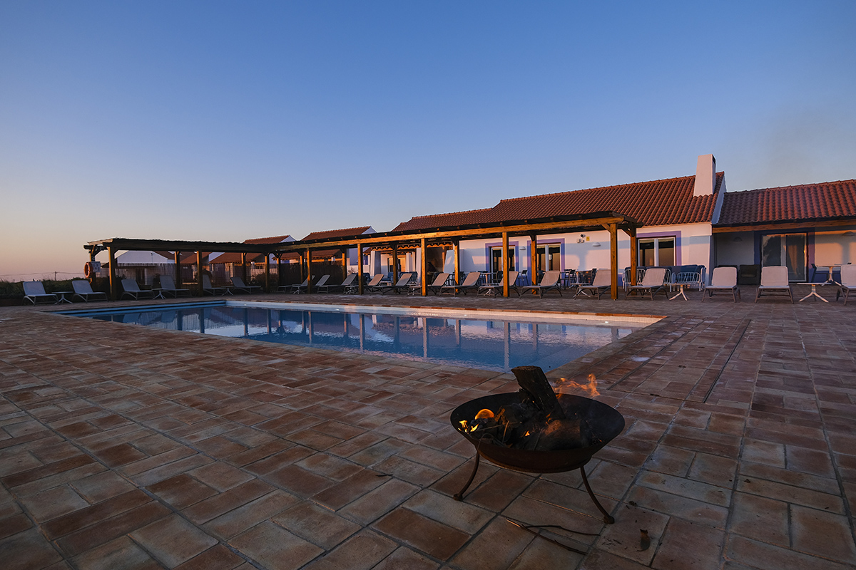 Ainda antes de os dourados raios de sol se extinguirem no horizonte, o staff acende as lareiras em redor da piscina e desce as proteções do alpendre, ligando os aquecedores. As noites no Alentejo da Costa Vicentina são frias e húmidas, até durante o verão. Mas há uma lareira acesa na sala de refeições e um cesto de pão com manteiga e azeitonas a chegar à mesa, seguidos de peixinhos da horta e salada de polvo com tempero caseiro. Basta reservar o jantar até às 18h.