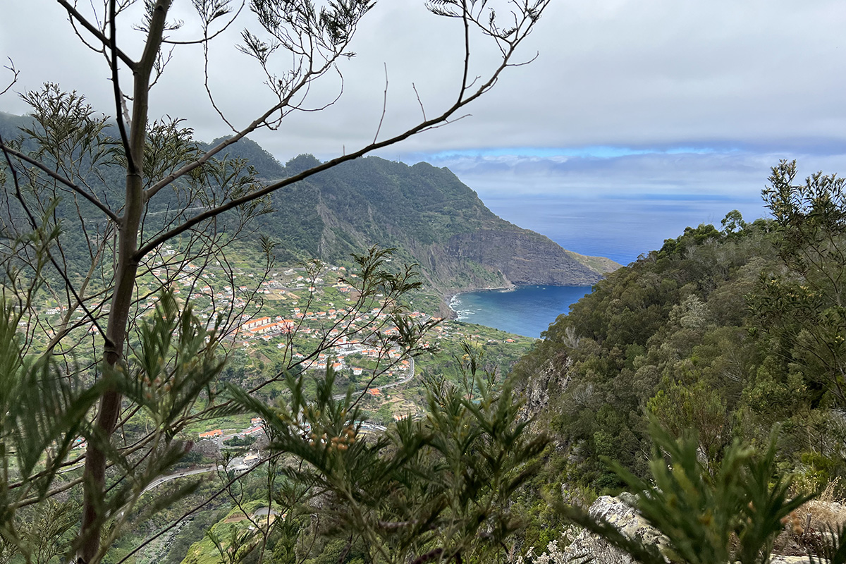 A verdade é que aquilo que nos acolhe é um túnel de verde e Natureza, numa subida íngreme, sim, mas larga qb para não percebermos o que despenca para lá das árvores e onde cruzamos caminhantes, alguns com ar de boa resistência, a maioria dos restantes nem por isso. Porque, e isto é a sério, toda aquela conquista é boa. É bonita de morrer e tem, ainda, resquícios do tempo de glória infantil de Teresa: um cabo de ferro que servia para fazer descer os feixes de lenha mais pesados até chão seguro. Há degraus naturais, a terra é batida e imaginamo-la escorregadia em dias de chuva, hoje está o melhor que se pode ter, fofa. E abre-se, depois de meia dúzia de chicanes já a mostrar os nervos da pedra, sobre o horizonte. Sobre o presépio que é o Porto da Cruz visto de riba, aconchegado na parte nobre, espalhado pintalgando a montanha na parte agrícola.