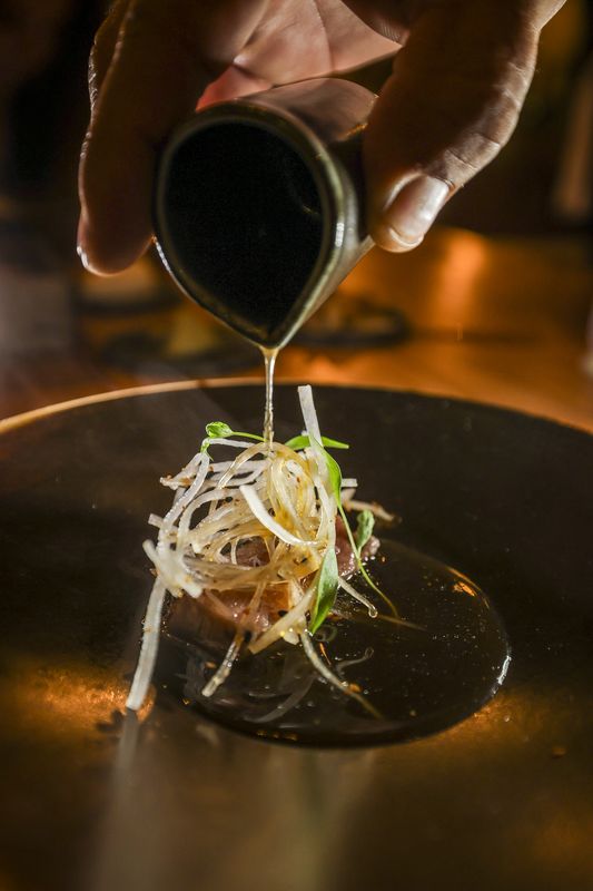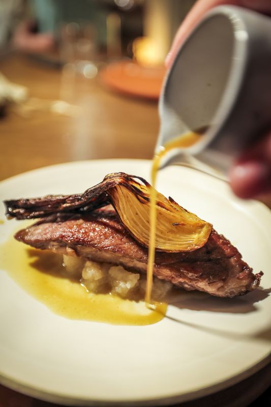 Aos comandos da forte aposta na gastronomia do hotel está o chef de 35 anos Marcelo Santos, cuja técnica aperfeiçoou em casas Michelin. Sob a luz quente e intimista do Azeitona, ao jantar, traz snacks como pão de Deus com gamba-violeta e maionese de coentros; pratos como arroz de carabineiro com beurre blanc; e sobremesas como uma torta de laranja, souflé de tangerina e goma de poejo e merengue. “Tendo em conta a zona geográfica do hotel, o nosso acesso aos pequenos produtores está facilitado”, sintetiza o chef, tendo o peixe e o marisco como favoritos.