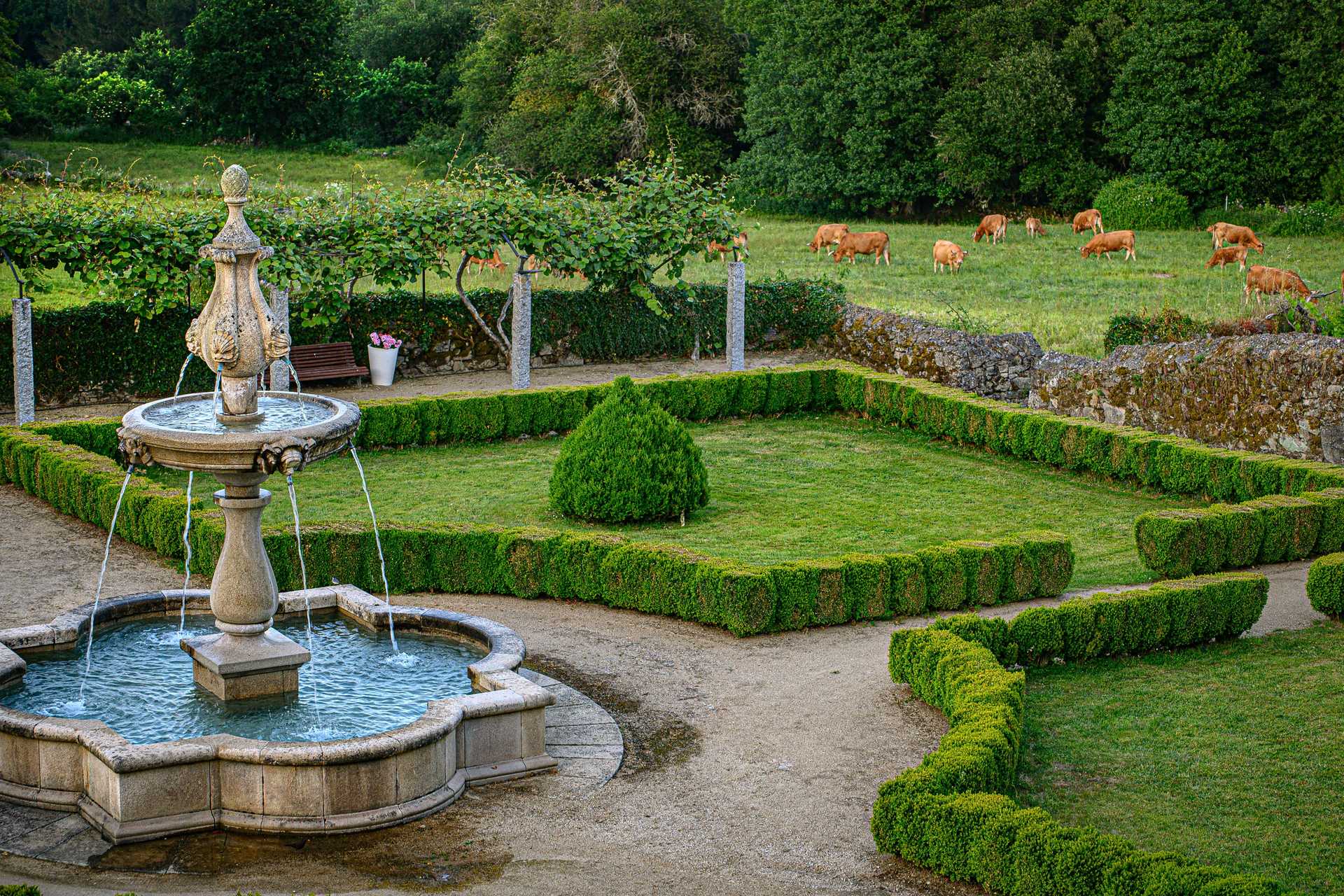 O som da água corrente acompanha todo o percurso que se pode fazer nos jardins do Palácio de Sober, em Lugo. “Cada jardim leva a outro jardim”, comenta Raquel Nuñez, diretora do HOTEL ÁUREA SOBER, acompanhando um passeio, o Botanic Tour, que usualmente se faz com os hóspedes, enquanto relata alguma da história do edifício cuja primeira construção remonta ao século VII, com uma torre medieval.