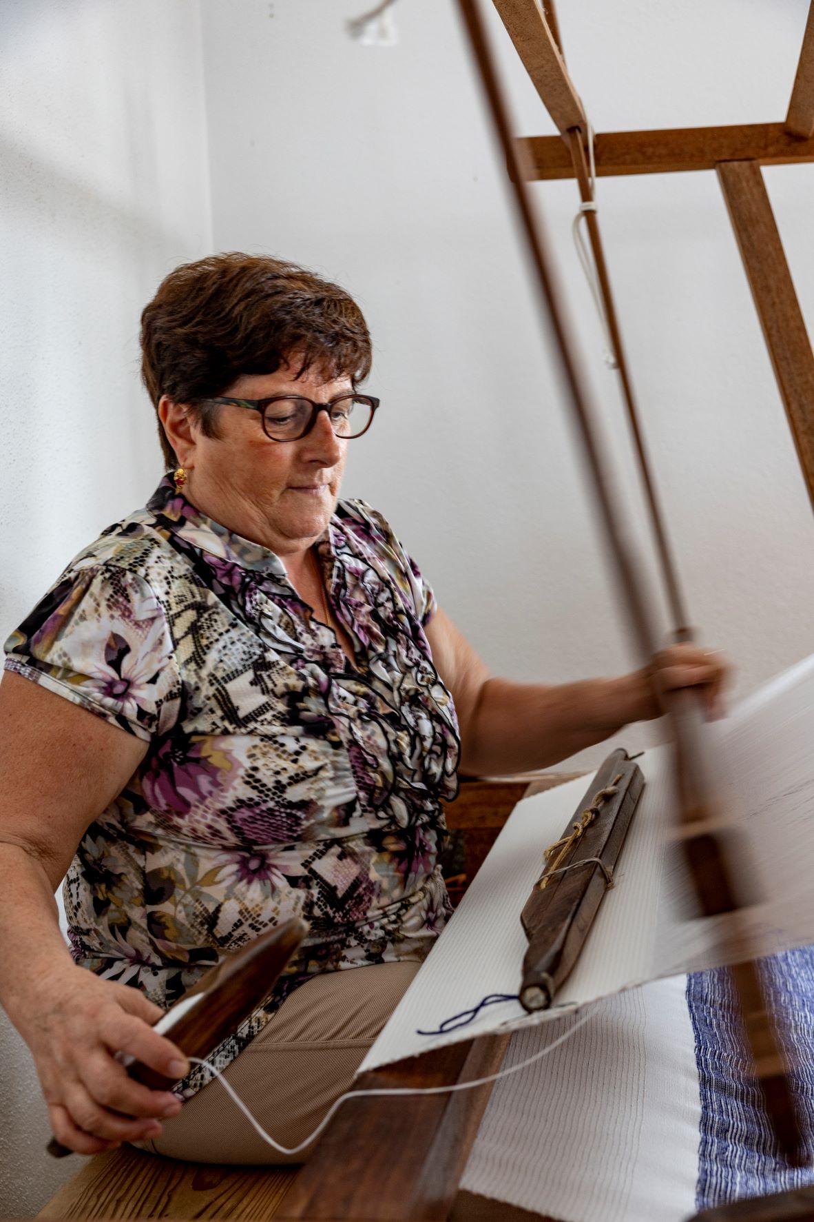 No piso superior, antes ou depois de saborear uma chávena desse café especial, vale a pena visitar a oficina da Casa de Artesanato Nunes. Ali, as artesãs Alzira e Carminda (mãe e madrinha de Dina) dão continuidade à arte das colchas de ponto alto, nos teares centenários recuperados por Manuel.