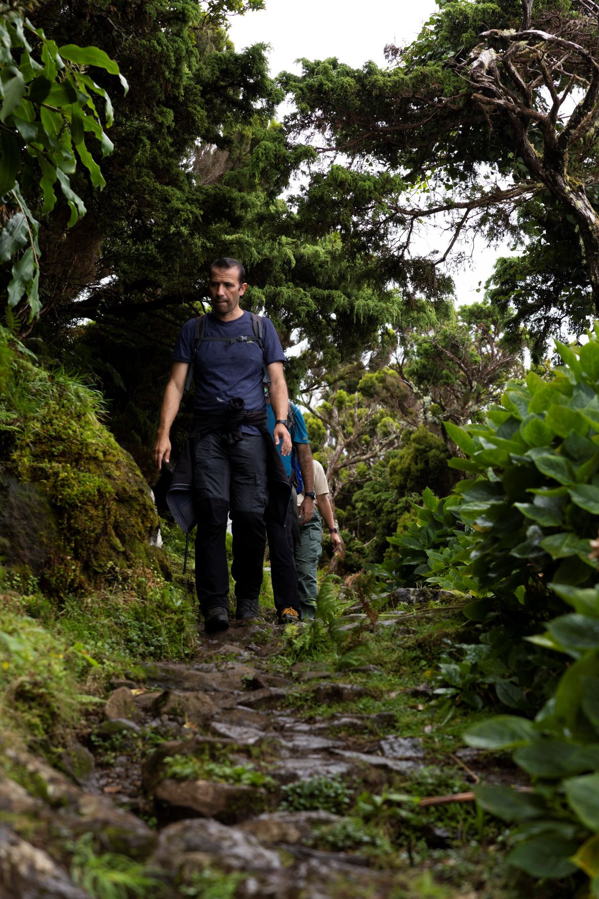 Em cada curva, belos quadros emoldurados pelo arvoredo, como a Cascata Pequena, abrem-se aos olhos dos caminhantes, que devem alternar entre manter o olhar no chão, atento às pedras irregulares e escorregadias, e parar em pés firmes para admirar o cenário, ouvir um chocalho ao longe ou ver esvoaçar alguma estrelinha. Os trilhos de São Jorge exigem alguma destreza e muita atenção. São lembretes do estoicismo dos habitantes, que palmilhavam regularmente aqueles caminhos, muitas vezes carregados de mercadorias. “O meu avô percorria quilómetros para levar milho e trazer peixe seco”, recorda Dina.