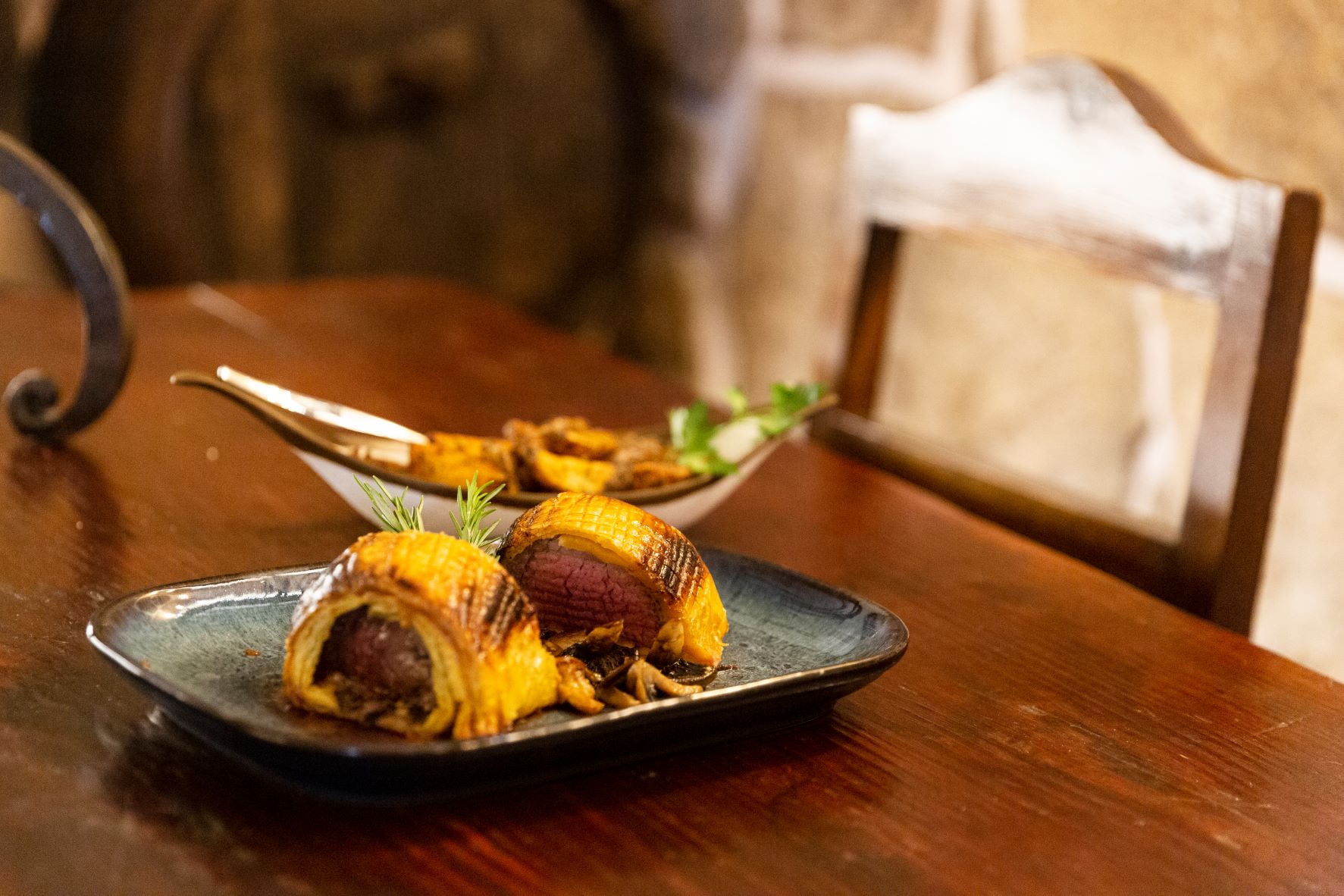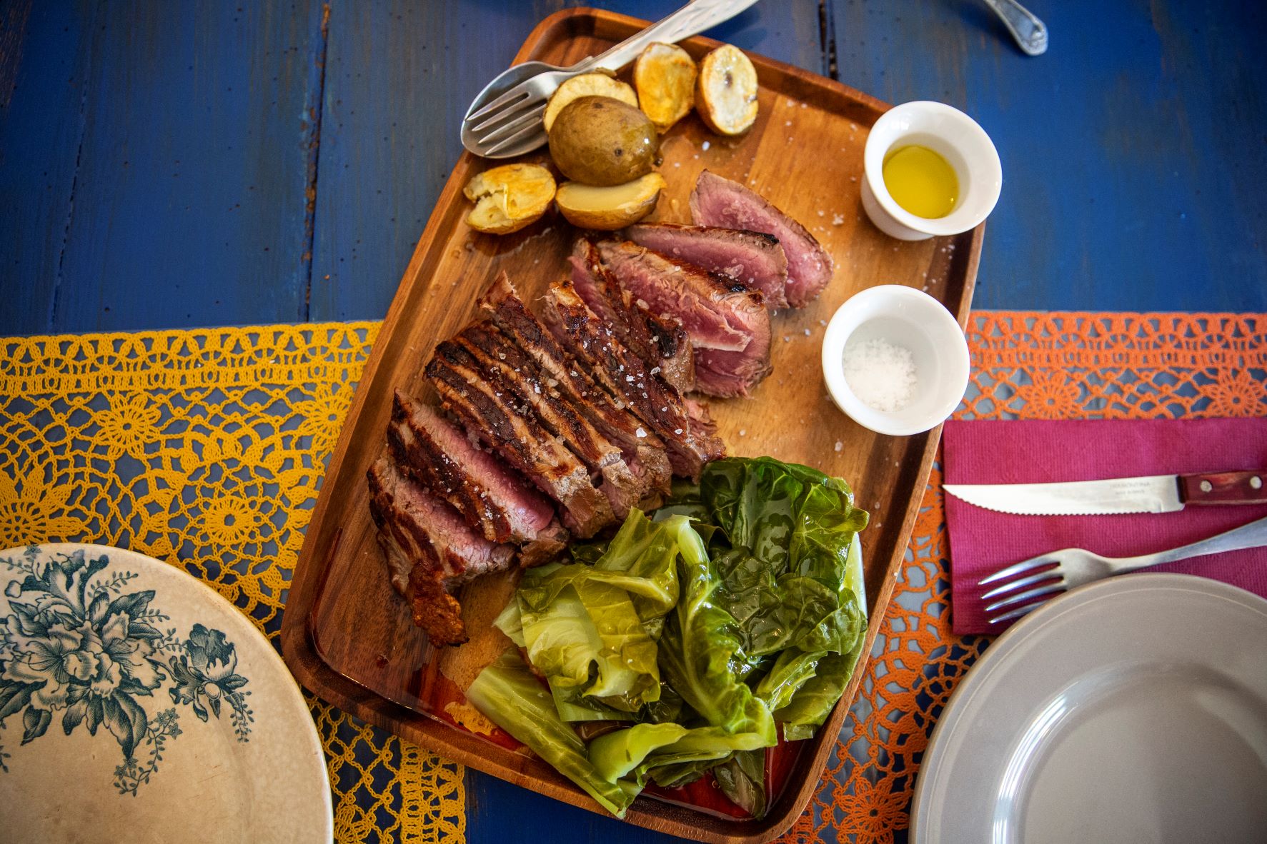 Não é a casa da avó, mas podia ser. Os trâmites são os mesmos: sentar à mesa e esperar pelo que vier, com garantia de ser caseiro e reconfortante. Convence-nos, desde logo, o pepino e o tomate com sal grosso. Mas também o queijo da Serra, que ao pousar na mesa faz Tiago dizer com orgulho: “é da minha terra o queijinho”. Na cozinha, não está uma avó, mas uma jovem talentosa a preparar comida de conforto, toda feita em forno a lenha. De lá, pode sair um tenríssimo polvo na telha, bacalhau assado, bife wellington ou até vitela (mas só passadas oito horas). Sob reserva também há cabrito assado, ossobuco, pica no chão, ou “o que apetecer ao cliente”. Carla é quem decide o menu do dia e, a não ser que haja um pedido especial, “o cliente raramente escolhe o que vai comer”, diz Tiago.