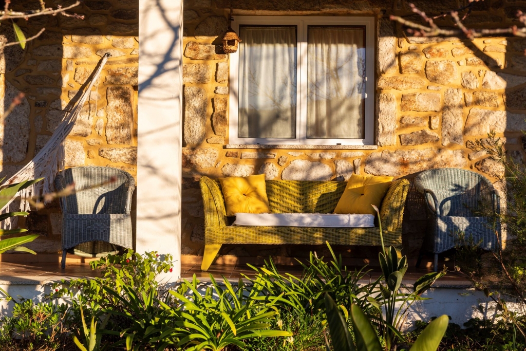 As bonitas memórias que Vanessa guarda da infância passada com os avós no campo, incentivaram-na a proporcionar uma experiência semelhante às suas duas filhas, transformando a casa que pertencia a uma tia, na freguesia de Areias de Vilar, num refúgio de campo para a família. “O que nós próprios fazemos às vezes, que é fugir da cidade e vir para aqui, é o que queremos que as pessoas façam também”, diz a proprietária. Tudo ali convida a desacelerar: o jardim cheio de árvores de fruto, a piscina (no verão), a cama de rede na varanda e até a pequena horta da qual os hóspedes podem fazer uso. A vizinha Conceição é quem está encarregue de tratar dos animais – galinhas e cabras – e de receber os hóspedes, que à chegada têm direito a um miminho de boas vindas. A casa é acolhedora, com dois quartos confortáveis, e durante o restauro, Vanessa manteve algumas características originais, como os azulejos da cozinha que, segundo lhe disse a tia, já teria sido ela a escolher em criança.